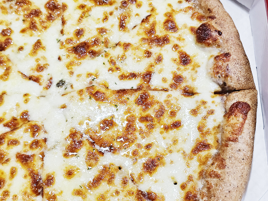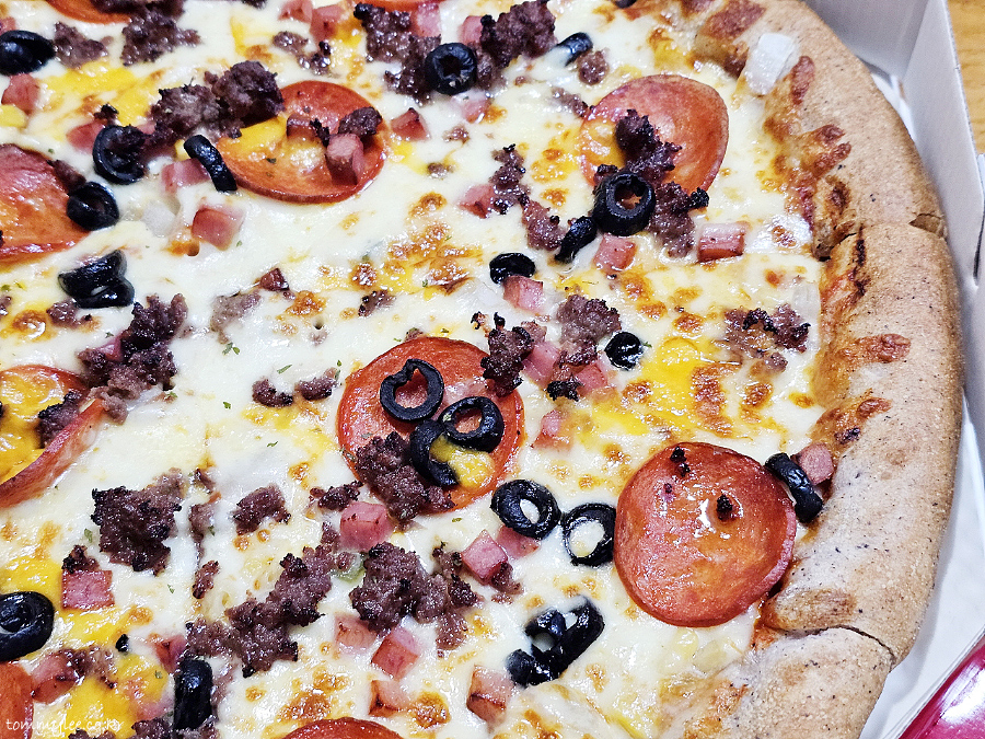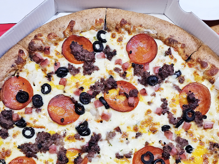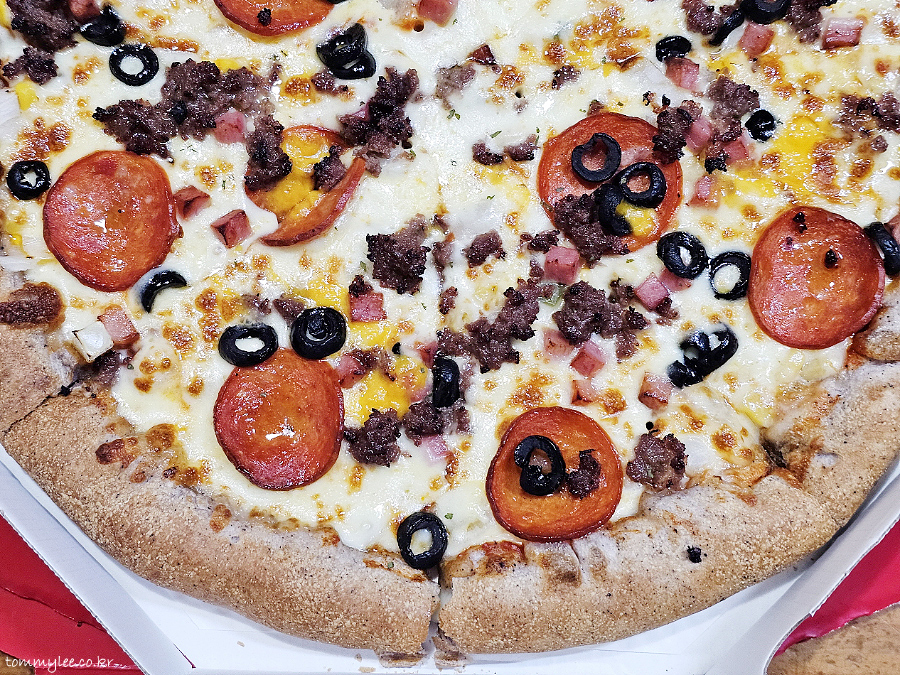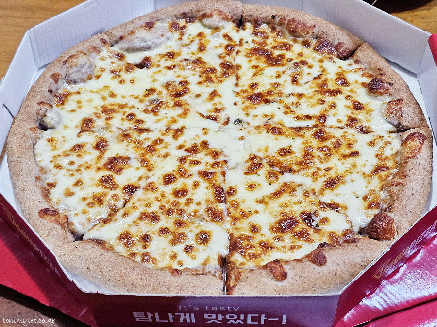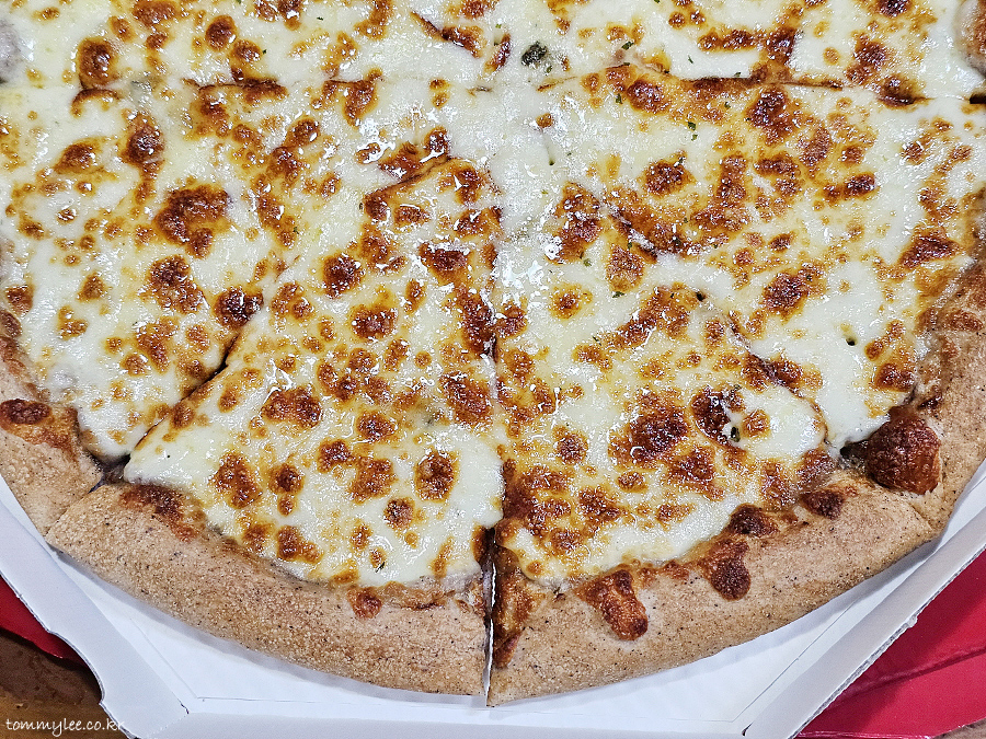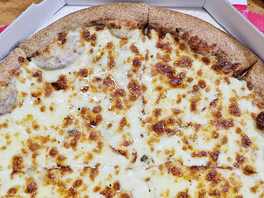 리뷰 이벤트로 치즈크러스트를 추가해 봤습니다.. 원래는 치즈크러스트 도우로 변경 시 3,500원 추가.. 암튼 치즈크러스트라서 엣지 부분이 볼록하게 올라와 있는 모습이 되겠고요..