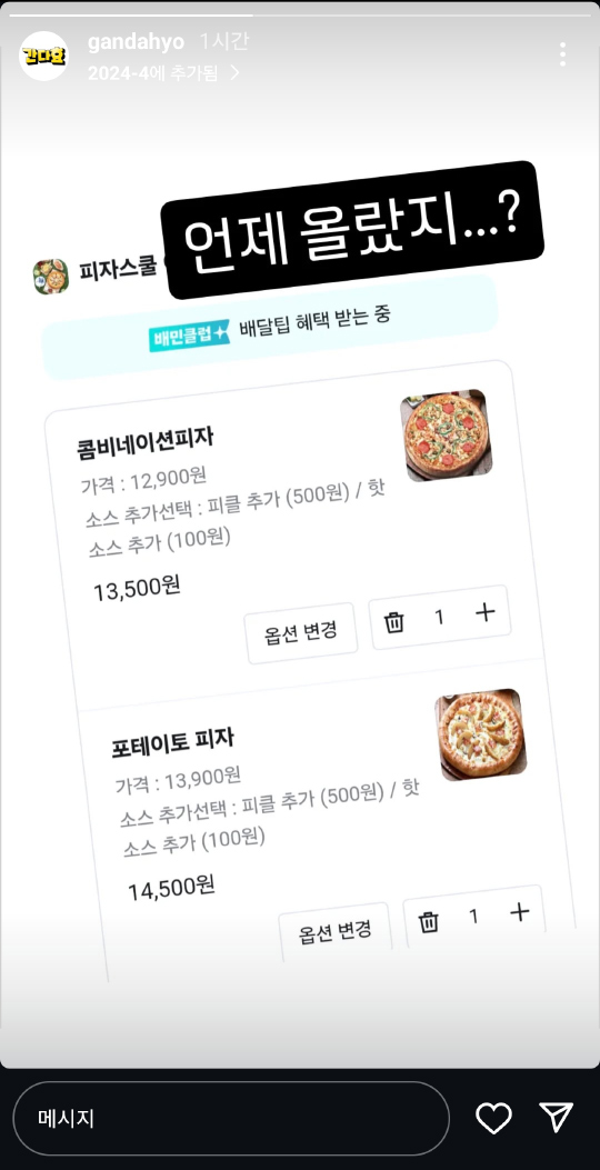 간다효님 팬분들을 위해 메기 먹방관련 한가지 정보를 드리자면.. 불변의 간다효 추천 피자 브랜드였던 피자스쿨의 급작스런 가격인상에 간다효님이 크게 충격을 받으셨나봐요.. 효기심을 제외한 유일한 팔로우 계정이었던 피자스쿨 인스타그램을 최근 언팔로우 하신 것으로 보아, 앞으로 피자스쿨보다는 탐나는피자 먹방을 더 많이 보게 될 것이라 조심스레 예상해 봅니다.. 피자스쿨 사요나라~..