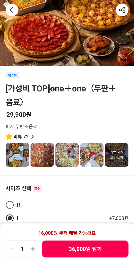 간다효님이 주문한 메뉴는 가성비탑 원플러스원 두 판+음료 메뉴였고요.. 중요한 가격은 레귤러 사이즈 2판 29,900원, 라지 사이즈 2판 36,900원이었네요.. 원플러스원 세트 레귤러 2판의 경우 할인율 15%지만, 라지 2판은 11%로 할인율이 낮아집니다만, 간다효님 팬이라면 레귤러 노노, 남기더라도 무조건 라지.. 매장 리뷰 이벤트로 치즈오븐스파게티 80%할인, 치즈크러스트, 치즈토핑, 치즈볼 2P, 치즈스틱 2P, 새우링 2P, 치킨텐더 2P, 치킨가라아게 2P, 버팔로스틱 2P, 음료 500ml 랜덤을 선택 제공받을 수 있답니다..