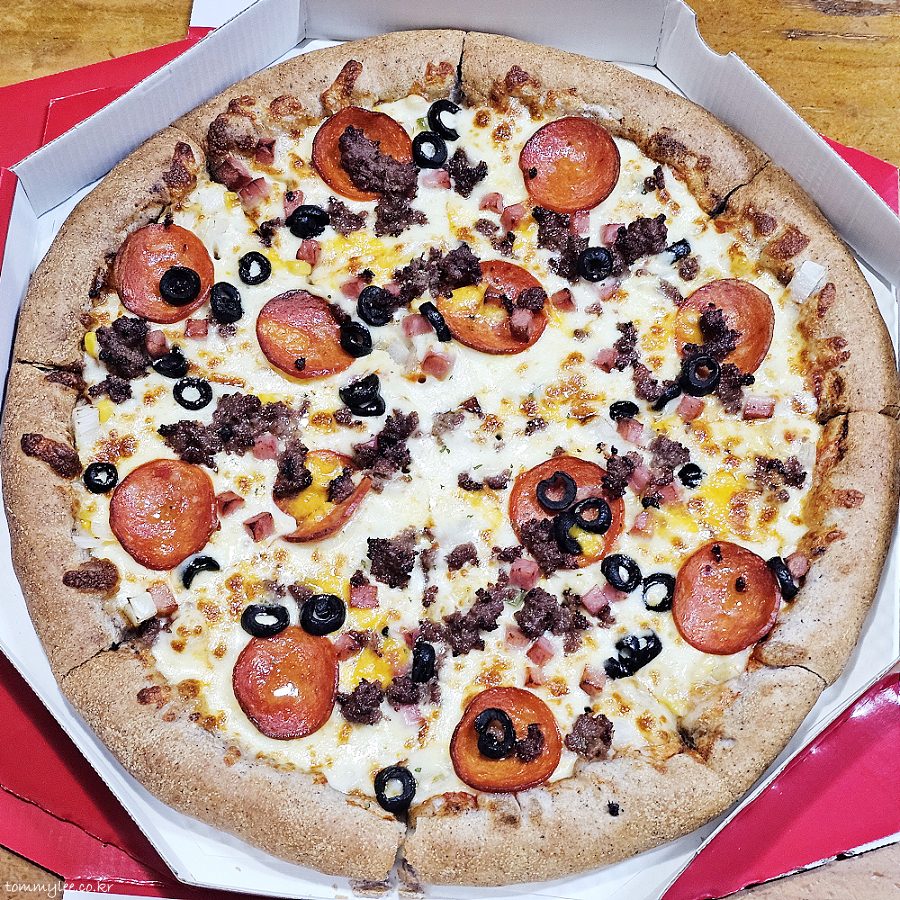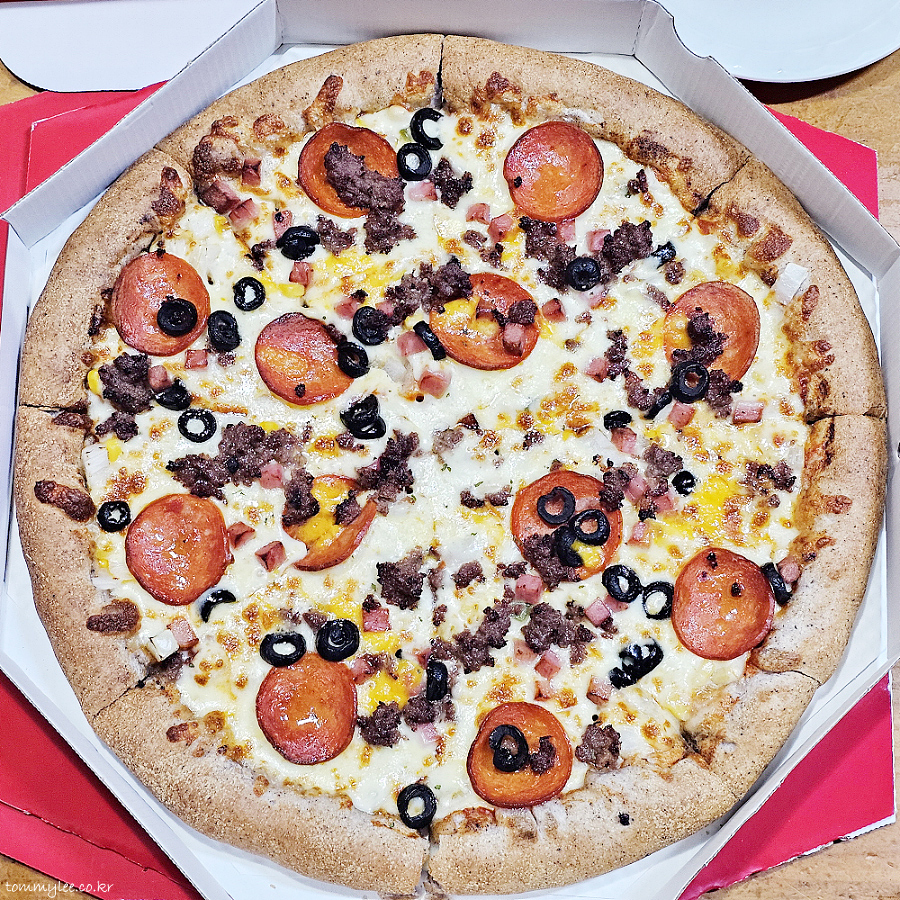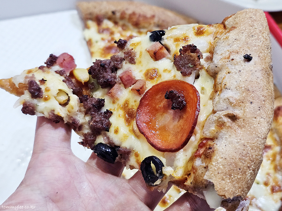 토핑인심이 너무 후해서 페퍼로니 피자랑 불고기 피자를 동시에 먹는 것 같은 착각마저 들게 했던 슈퍼 콤비네이션 피자..
