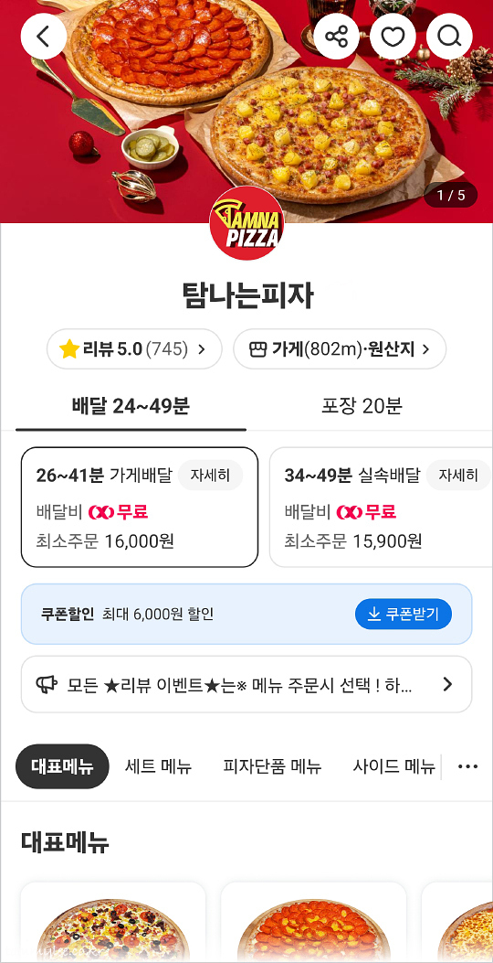 제가 요기요 요기패스X 구독자인 관계로 탐나는피자는 요기요를 이용해 주문하게 되었습니다.. 요기패스X는 배달비 무료.. 탐나는피자 매장별로 다르겠지만 제가 주문한 곳은 최대 6천원 쿠폰할인이 붙어 있었답니다.. 기간한정이 아닌 상시 할인 이벤트라고 보셔도 될 듯.. 제공 쿠폰은 총 6종으로 10,000원 이상 1,000원, 15,000원 이상 2,000원, 20,000원 이상 3,000원, 30,000원 이상 4,000원, 40,000원 이상 5,000원, 45,000원 이상 6,000원 할인이었습니다..