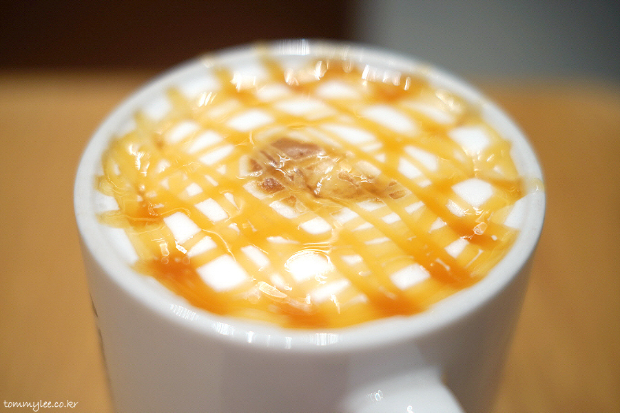 카라멜 마키아또에 카라멜 시럽이 들어가는 줄 알고 계시는 분들이 많은데요.. 단맛은 바닐라시럽 + 카라멜 드리즐이랍니다.. 아로마노트 2샷에 바닐라 시럽, 우유 거품 위에 카라멜 드리즐 뭐 요렇다는 거..
