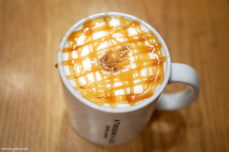 제 입맛에는 바닐라 라떼가 더 나은지라 잘 안 마시는 카라멜 마키아또이지만 오늘은 슈퍼투썸데이니까 특별히.. 정중앙에 에스프레소 닷, 살짝 도톰한 카라멜 드리즐까지 의외로 충실하게 만들어 주심..