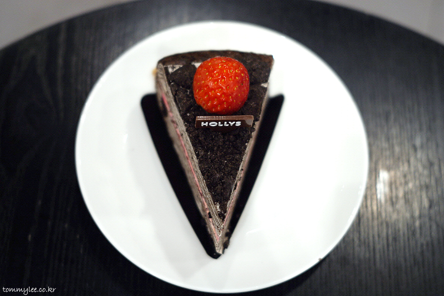 케이크 상단에 두툼하게 블랙쿠키 크럼블이 올라가 있고요.. 할리스 초콜릿 픽과 생딸기로 장식..
