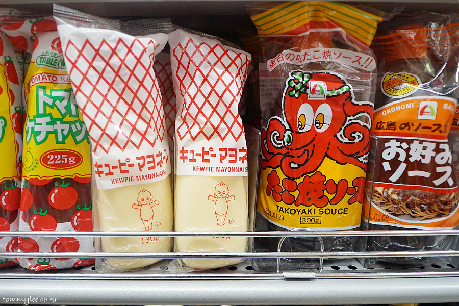 큐피 마요네즈는 돈키호테보단 사이즈가 작아서 다이소가 더 좋아요.. 타코야키 소스, 오코노미야키 소스 다이소에선 모두모두 100엔..