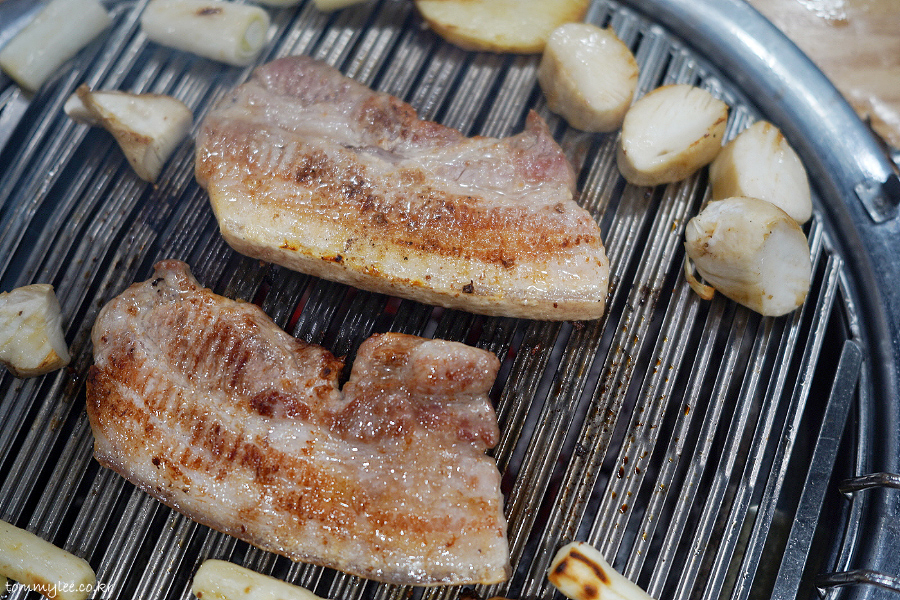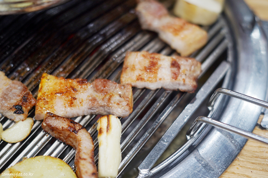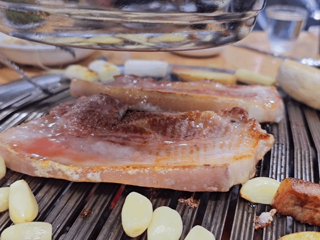 삼겹살이 엄청 요란하게 잘 구워지네요.. 사이드 메뉴들도 거의 다 구워진 듯하고..