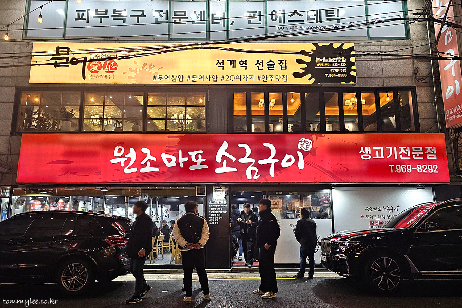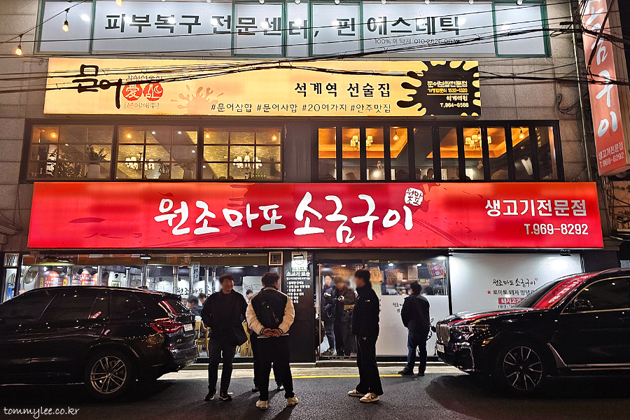 THE ORIGINAL MAPO SALT GRILL.. SEOKGYEO.. 원조마포소금구이 석계점.. 영업시간 : 11:00~23:00.. 주소 : 서울 성북구 화랑로40길 55.. 전화 : 0507-1474-8293.. 매장 밖에 손님분들이 많이 대기하고 계셨어요.. 웨이팅 맛집이었음..