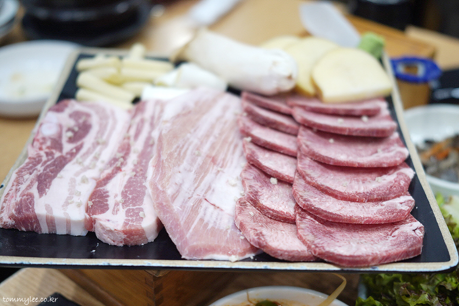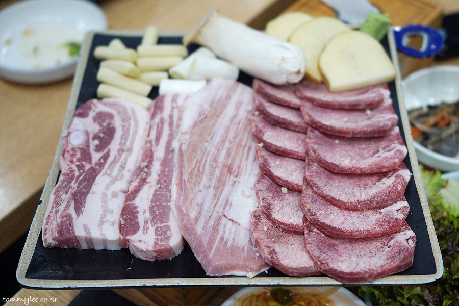 고기고 생각보다 빨리 제공되었어요.. 고기 원산지는 돼지고기 국내산, 우설은 한우라고 합니다.. 여긴 그래도 양이 넉넉한 편이네요..