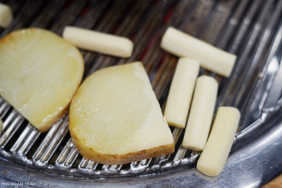 사이드 메뉴들 이제 올려야 된다고 하시면서 감자랑 떡 같은 거 불판에 세팅..