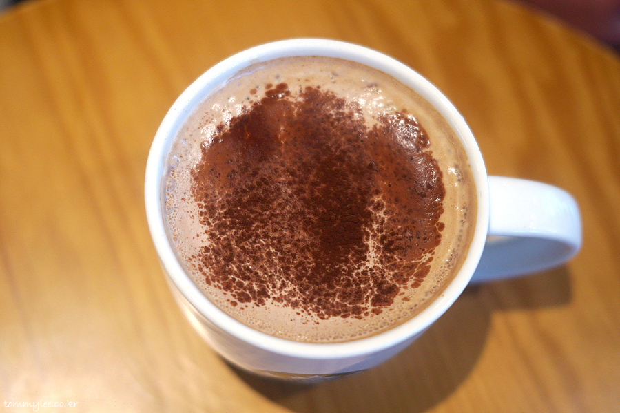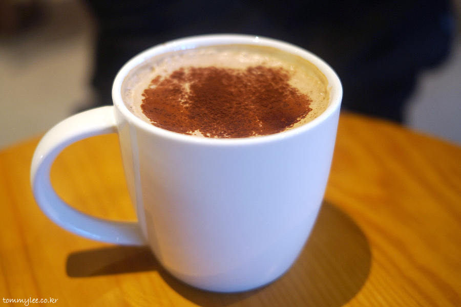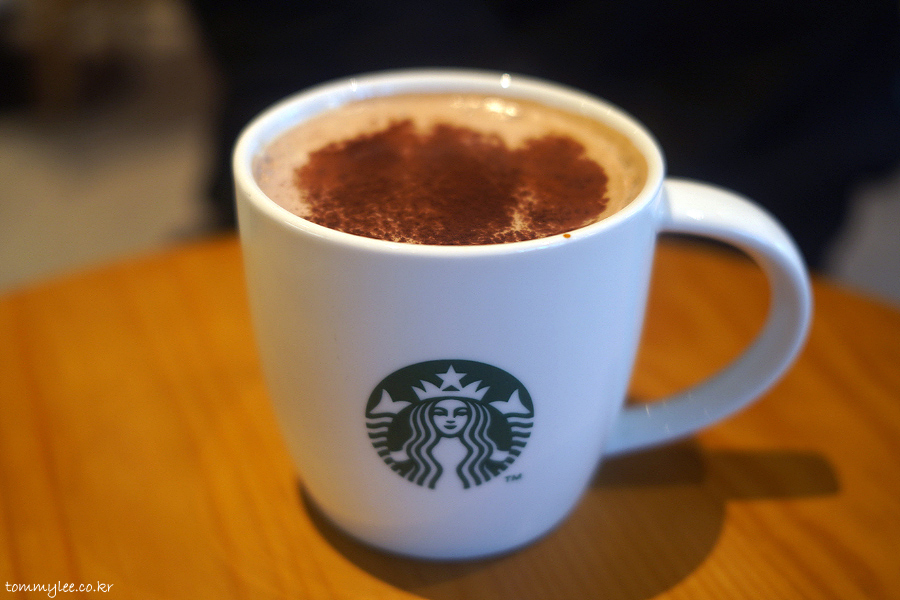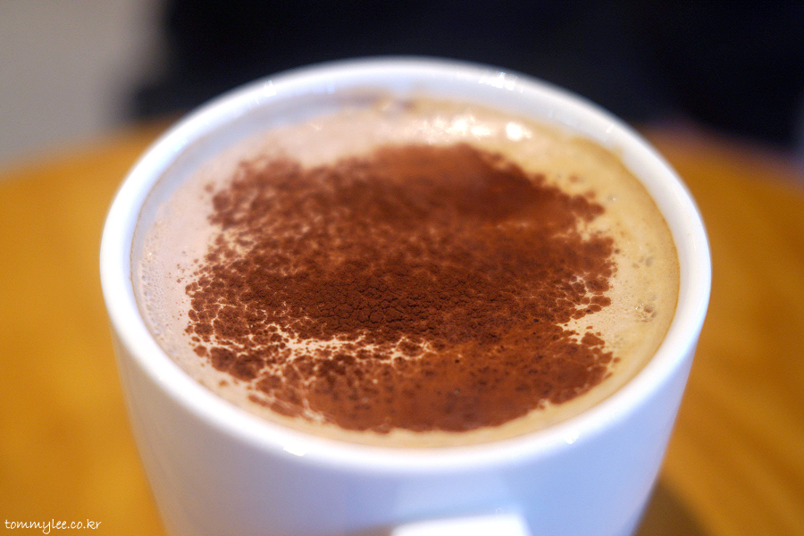 에스프레소 2샷에 모카 시럽, 헤이즐넛 시럽에 헤이즐넛 초콜릿 크림이 올라가고 초콜릿 파우더를 뿌려 마무리..
