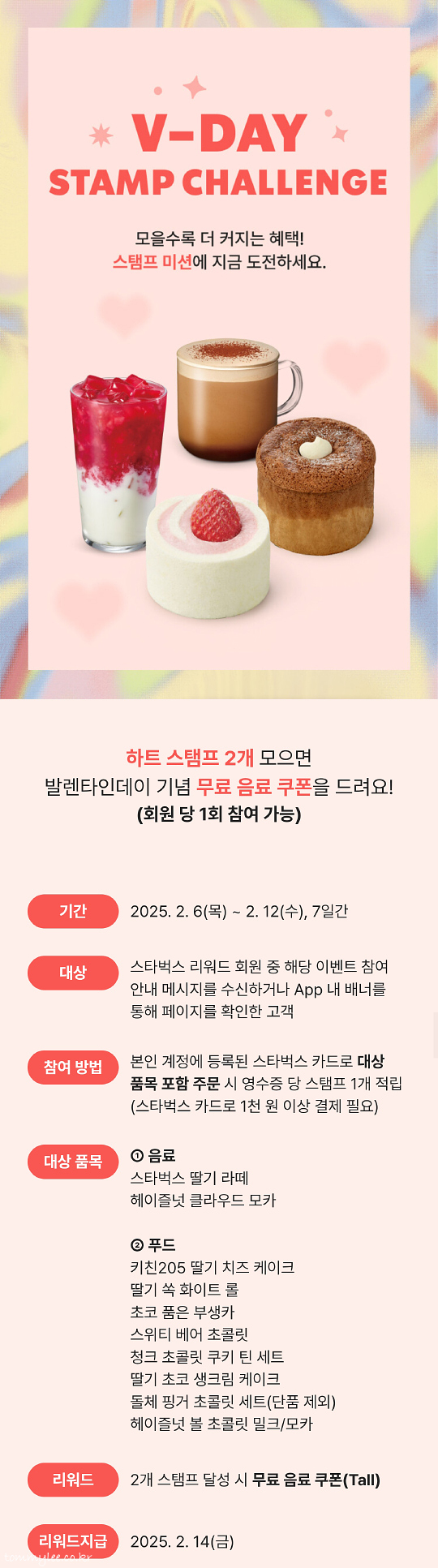 V-DAY STAMP CHALLENGE.. 발렌타인 하트 스탬프 2개를 모으면 발렌타인데이 기념 무료음료 쿠폰을 준다는 내용의 훈훈한 행사입니다.. 대상 메뉴도 딸기라떼, 헤이즐넛클라우드모카, 키친205딸기치즈케이크, 딸기쏙화이트롤, 초코품은부생카, 스위티베어초콜릿, 청크초콜릿쿠키틴세트, 딸기초코생크림케이크, 돌체핑거초콜릿세트, 헤이즐넛볼초콜릿 이렇게 엄청 많고 스탬프 2개만 찍으면 OK라 정말 쉬운 미션이었어요..