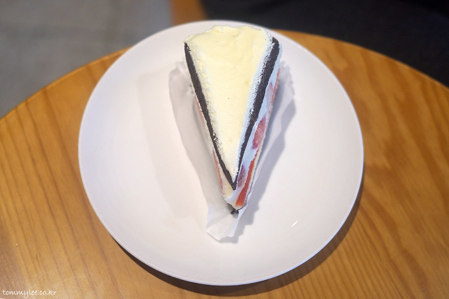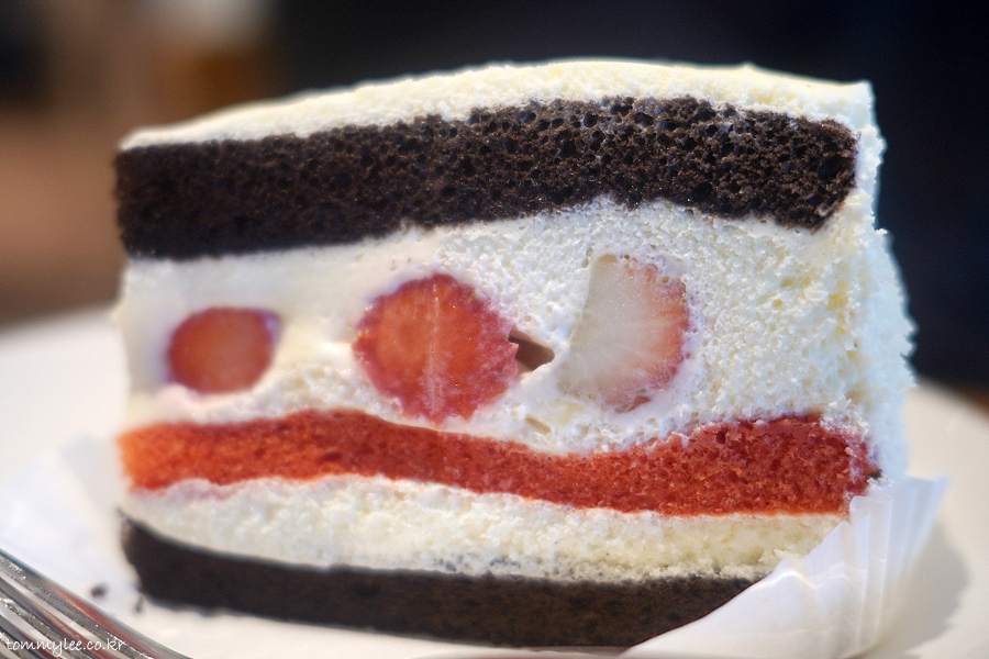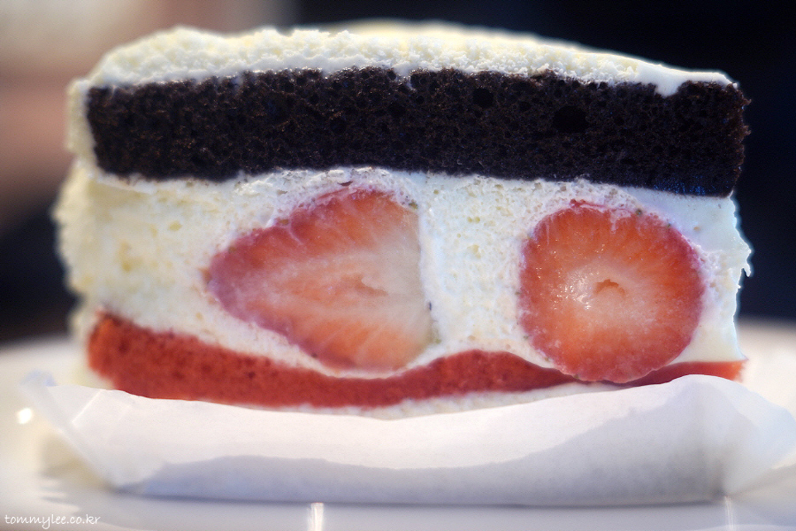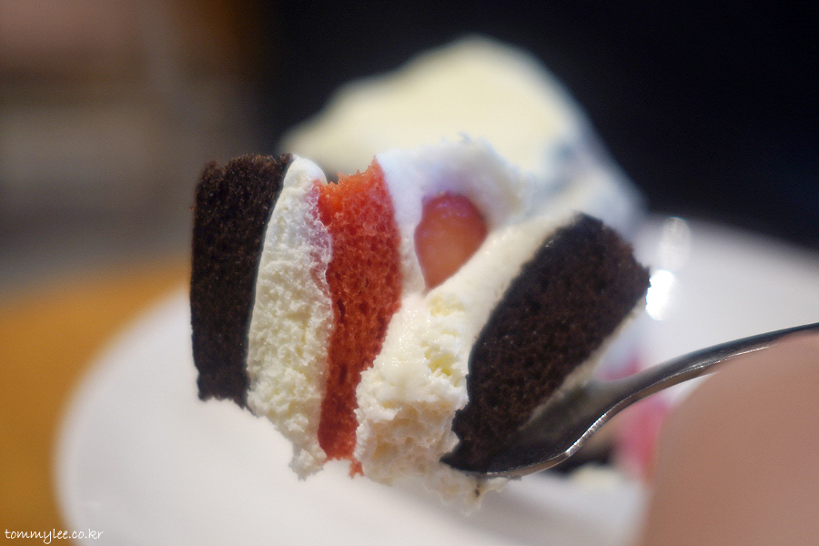 케이크 시트 사이에 딸기와 생크림 조합이라 맛이 없을 수는 없어요.. 초콜릿 시트는 초코맛이 착실히 나는데.. 딸기 시트는 그냥 색깔만.. ㅋㅋㅋ..