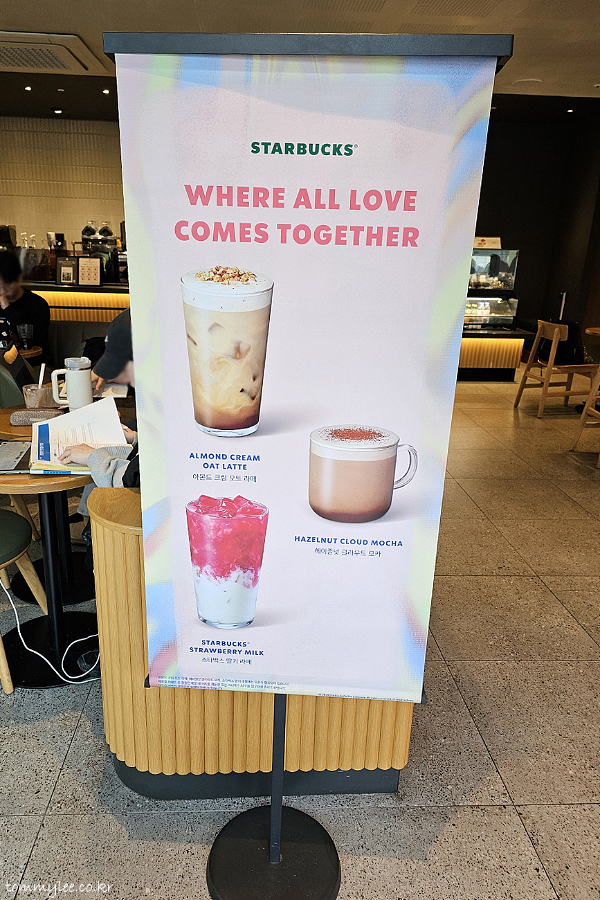 WHERE ALL LOVE COMES TOGETHER.. 아몬드크림오트라떼, 헤이즐넛클라우드모카, 스타벅스딸기라떼 3종 프로모션 중입니다..