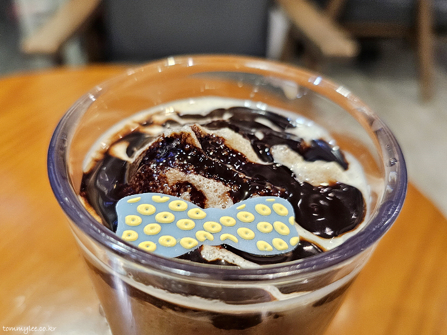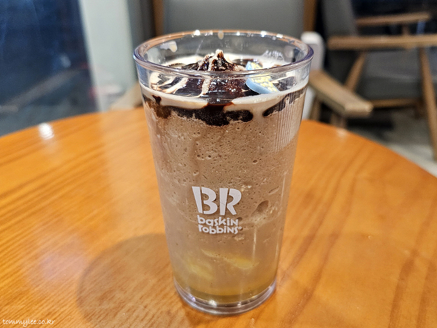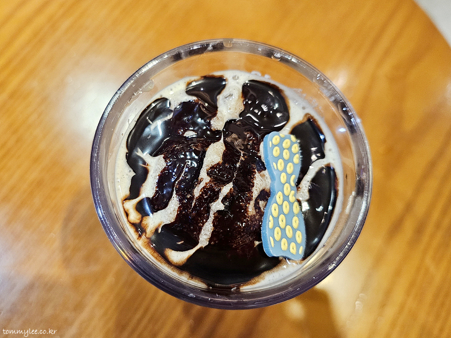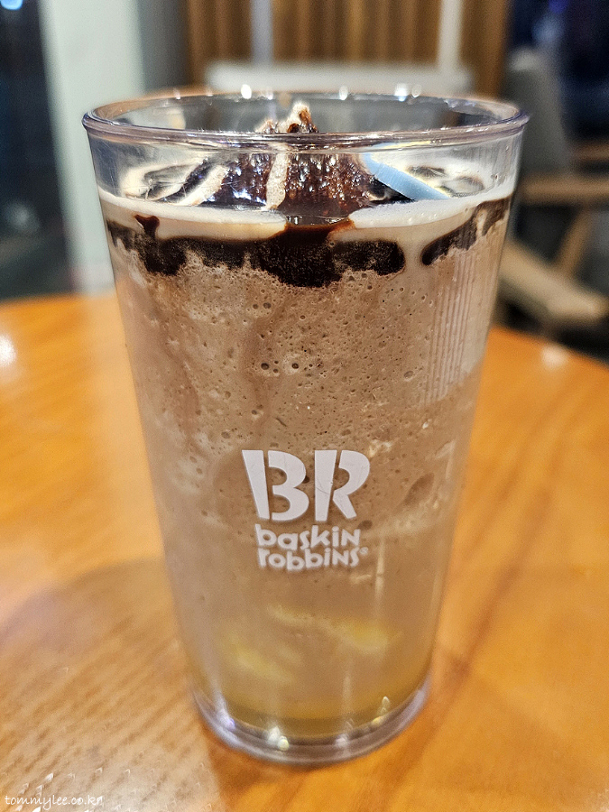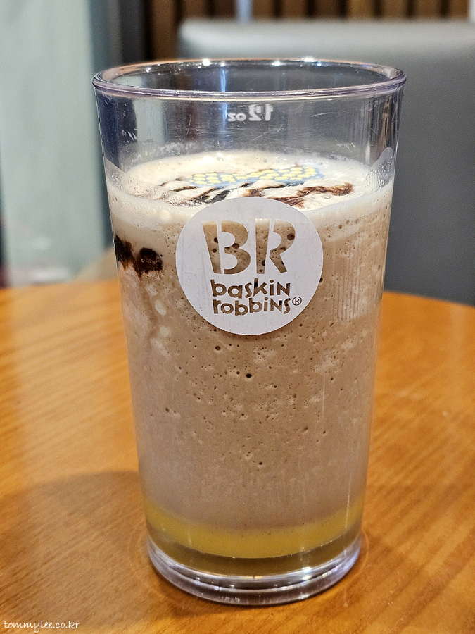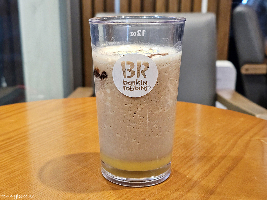 그리하여 다시 나온 초코 도쿄바나나 블라스트입니다.. ㄷㄷㄷ.. 아까와는 확연히 다른 모습.. 초코감도 확실히 표현되었고 괜찮은 비주얼로 나왔어요.. 지금 제빙기 상태가 안좋아서 얼음을 블렌더에 돌리면 싹다 녹아서 물이 된다고 합니다.. 그래서 저렇게 나온 거였네요.. 근데 매니저님이 제가 작년 봄에 도쿄바나나 블라스트를 먹은 걸 알고 계시더라고요.. 아니 그걸 기억한다고요??.. ㅡㅡ;;..