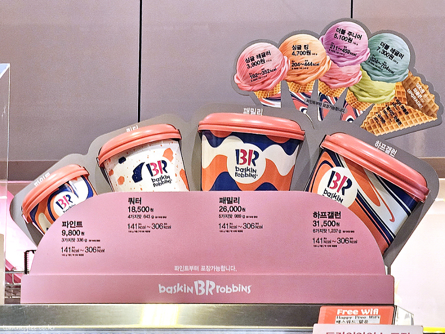 배스킨라빈스 아이스크림 사이즈 및 가격.. 싱글레귤러 3,900원, 싱글킹 4,700원, 더블주니어 5,100원, 더블레귤러 7,300원 / 파인트 9,800원, 쿼터 18,500원, 패밀리 26,000원, 하프갤런 31,500원..