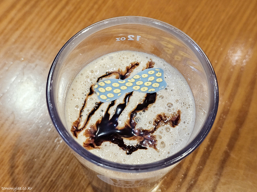 암튼 의도한 바는 아니었으나 우여곡절 끝에 다시 제공된 초코 도쿄바나나 블라스트입니다.. 초콜릿 드리즐이 두툼하게 들어가고 얼음 알갱이가 살아 있으니, 양도 전보다 뿔었고 토핑 리본도 더 안정적인 느낌으로 보였어요..