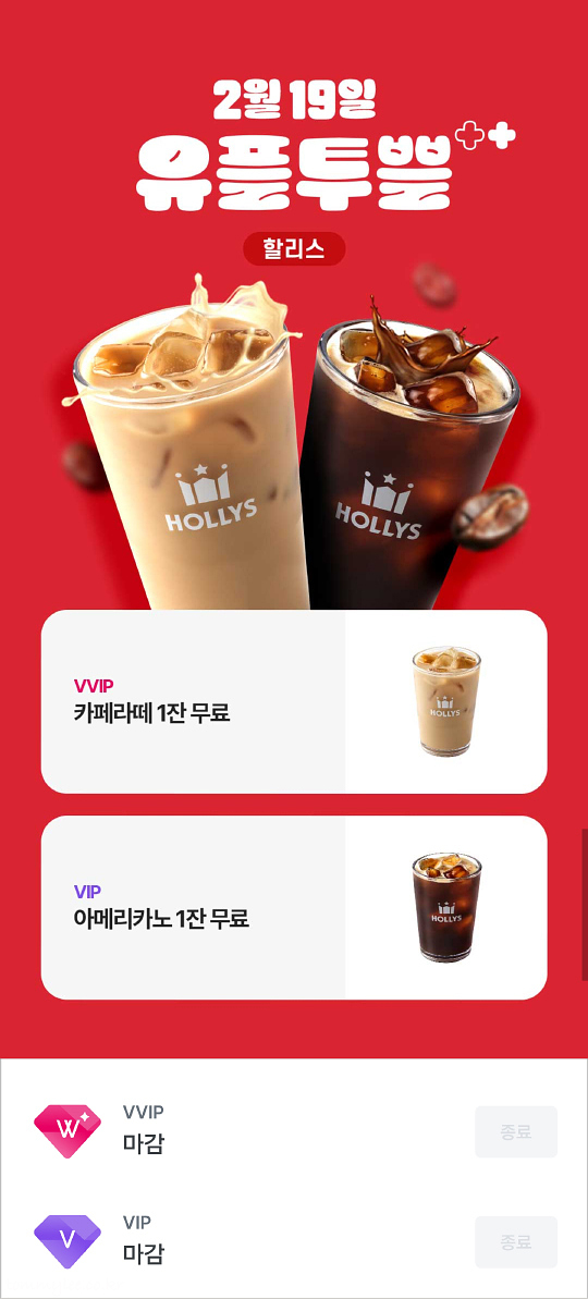 유플러스 멤버십 유플투쁠.. 2월 할리스 유플투쁠 혜택은 VVIP 카페라떼 1잔 무료, VIP 아메리카노 1잔 무료입니다.. 예전엔 경쟁이 그다지 치열하지 않았는데.. 유플투쁠 쿠폰 받으시는 분들이 엄청 많이 늘었어요.. 저도 못받을 뻔.. ㅠ.ㅠ.. 12시 정도에 준비된 쿠폰이 전량 소진되더라는.. ㄷㄷㄷ.. 유플투쁠 이용하시는 분들은 조기 소진 주의하세요..