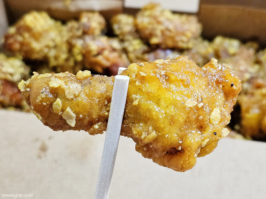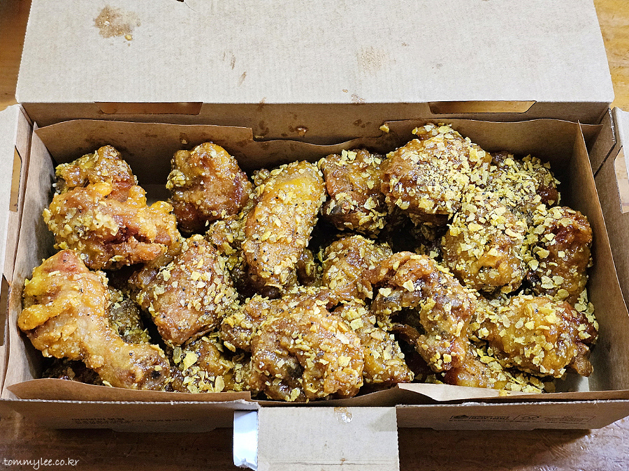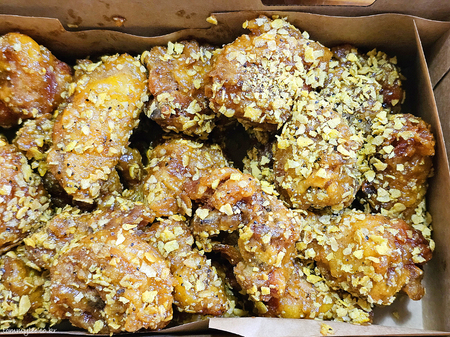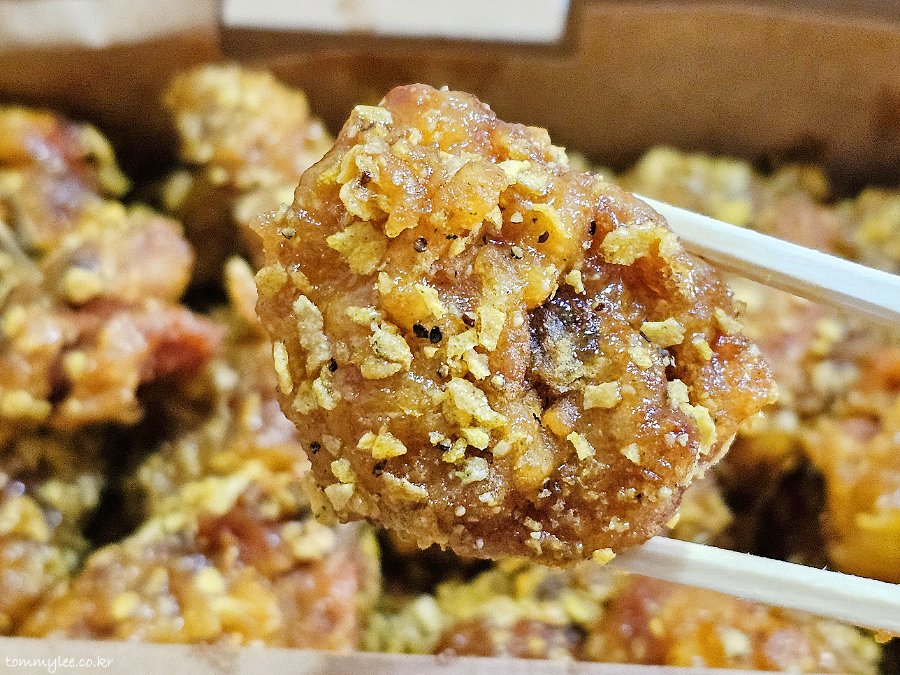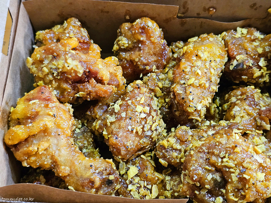 옥수수 풍미가 과하지 않고, 허니버터스러운 소스가 입에 착착 붙고 맛있습니다.. 바삭한 콘후레이크 토핑도 굿굿.. 교촌은 소스가 골고루 잘 입혀져 있어서 좋네요..