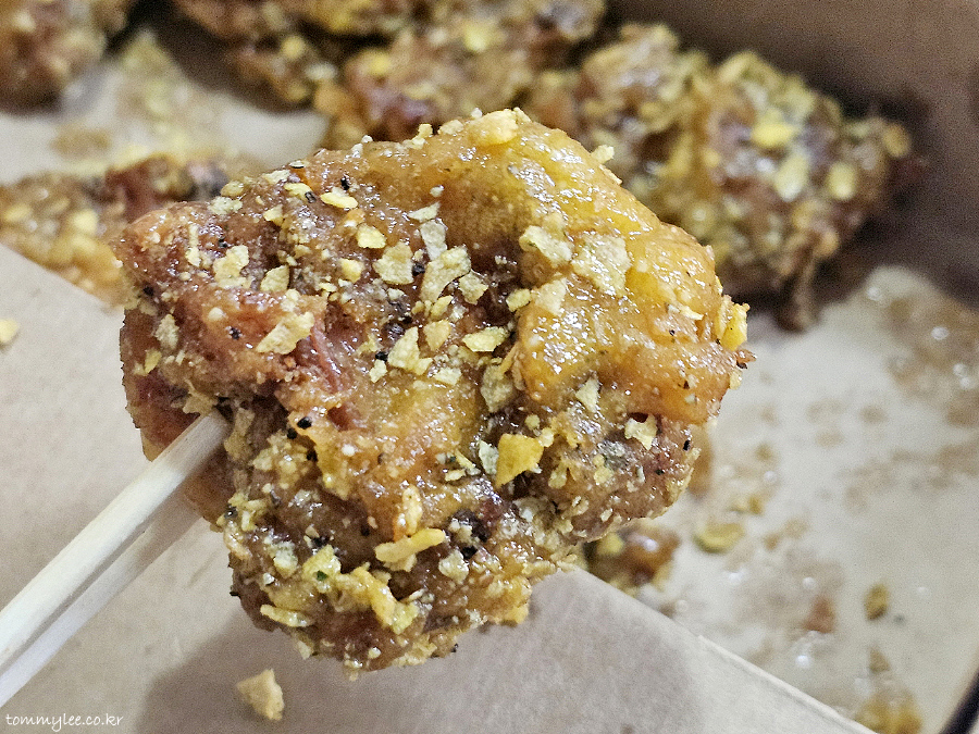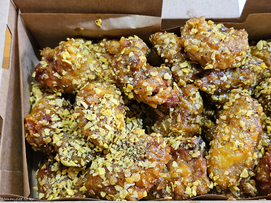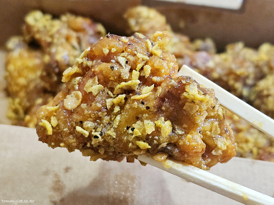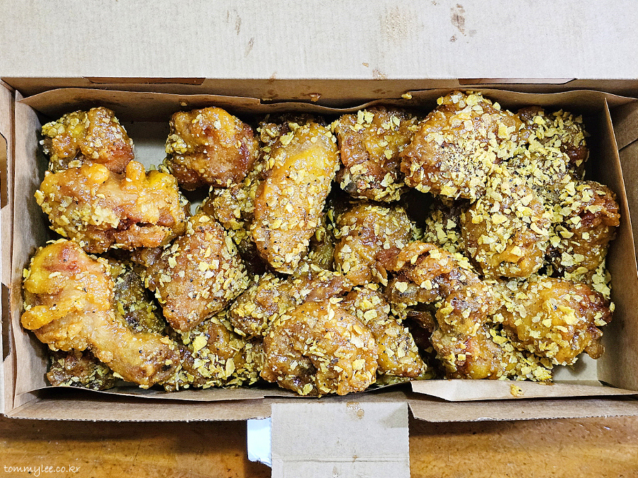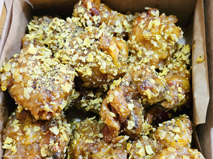 옥수수 풍미가 과하지 않고, 허니버터스러운 소스가 입에 착착 붙고 맛있습니다.. 바삭한 콘후레이크 토핑도 굿굿.. 교촌은 소스가 골고루 잘 입혀져 있어서 좋네요..
