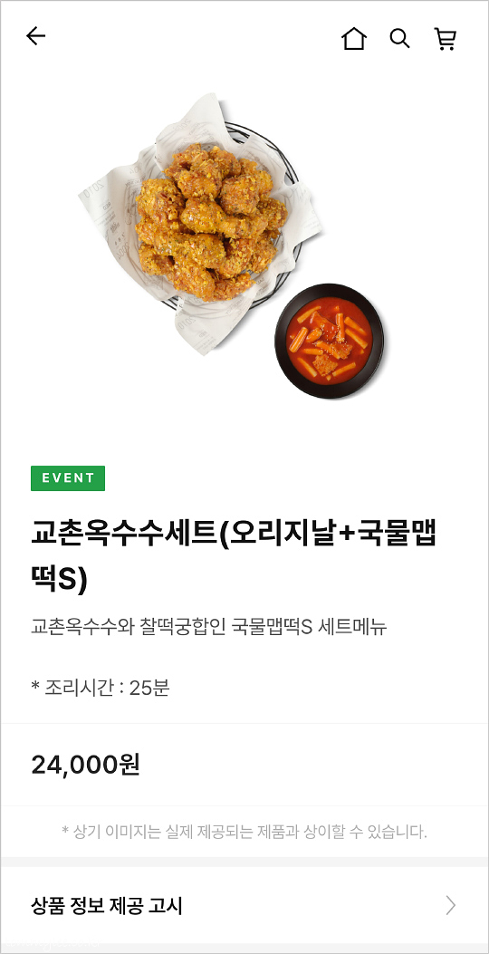 교촌 옥수수치킨은 오리지날, 통안심, 순살 3가지 메뉴가 있고 세트로도 주문이 가능하더라고요.. 그래서 교촌옥수수 오리지날과 국물맵떡S로 구성된 교촌옥수수세트로 변경해서 주문했습니다.. 추가금 4,000원 + 배달료 4,000원 해서 8,000원 추가 결제해서 주문완료..