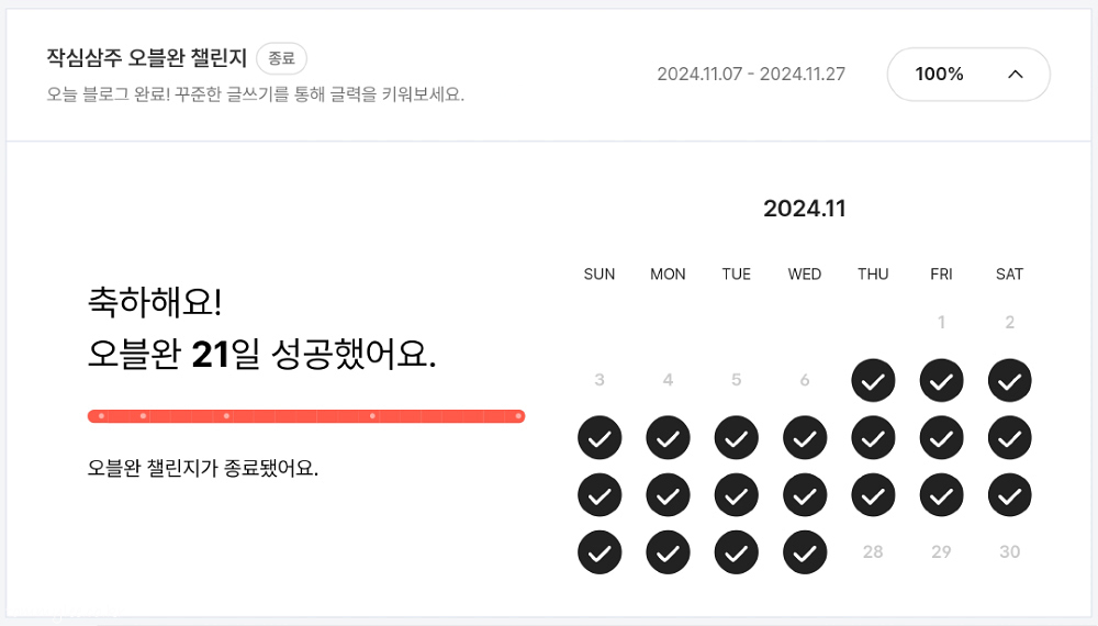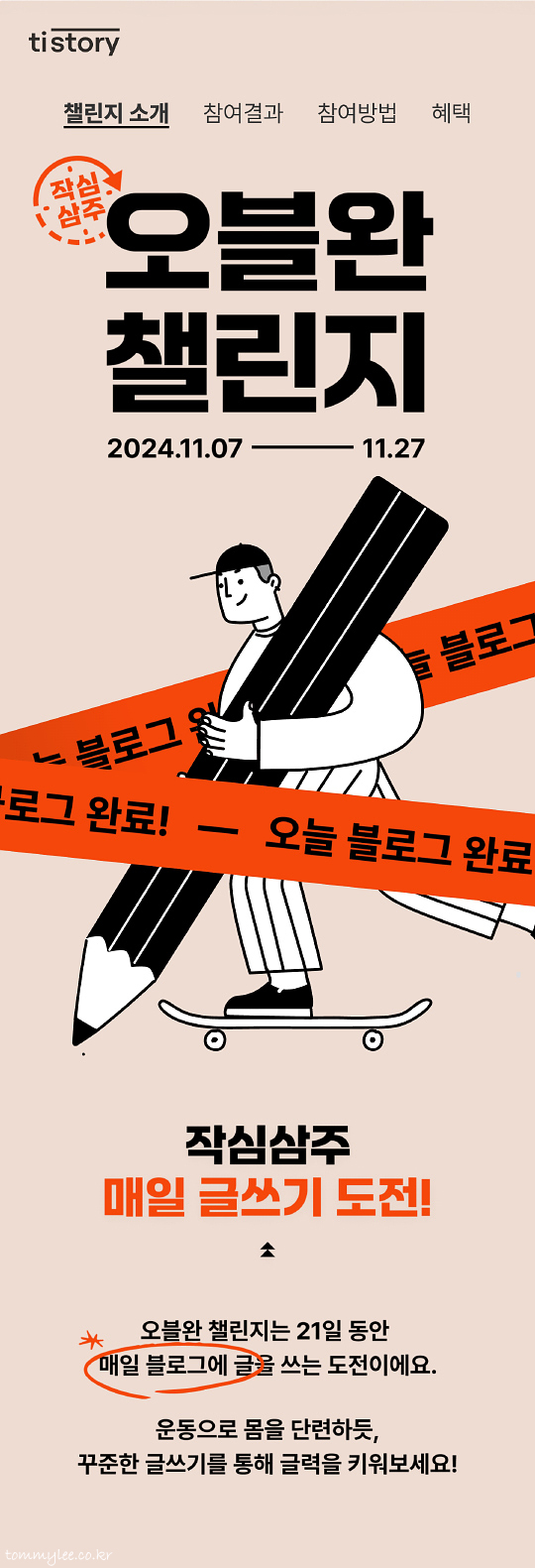 게으른 티스토리 생활에 새로운 활력을 불어넣고자 저는 오블완 챌린지 매일 글쓰기에 과감히 도전해서.. 21일 연속 글쓰기에 성공했었는데요.. 매일 블로그에 글을 쓰는 도전이 쉽지만은 않았지만.. 시작했으면 끝을 보자는 일념으로 도전에 성공했던 기억이 있습니다..