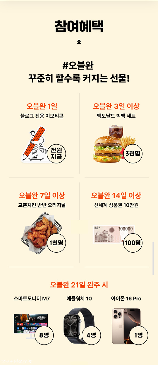 오블완 챌린지 참여혜택으로.. 오블완 1일, 블로그전용 이모티콘, 오블완 3일 맥도날드 빅맥세트, 오블완 7일 교촌치킨 반반오리지날, 오블완 14일 신세계상품권 10만원 / 오블완 완주 : 아이폰16프로, 애플워치10, 삼성스마트모니터M7.. 이렇게 빵빵한 경품이 준비되어 있어서 작심삼주 동기부여는 제대로 되었답니다.. 저는 삼성 스마트모니터 M7을 노렸는데요.. 큰 32인치 모니터와는 인연이 없는지.. 결과는 아쉽게도 교촌치킨이었답니다..