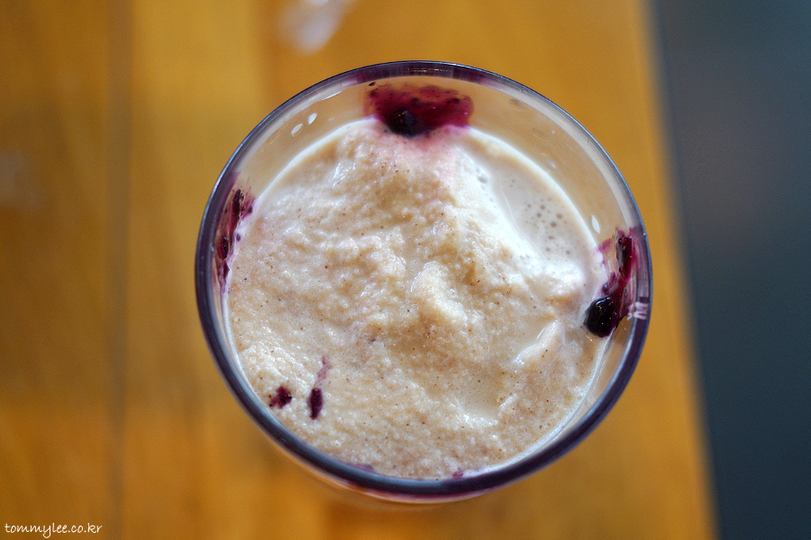 땅콩버터와 바닐라 아이스크림을 넣고 갈아낸 듯한 피넛버터 쉐이크 느낌의 프라페인데요.. 블루베리를 더해 마치 스머커에서 나온 구버 그레이프맛 땅콩버터 같은 느낌을 주고 있어요.. 요즘도 코스트코에서 스머커 구버 팔려나요??.. 모르는 분들 많을 듯..
