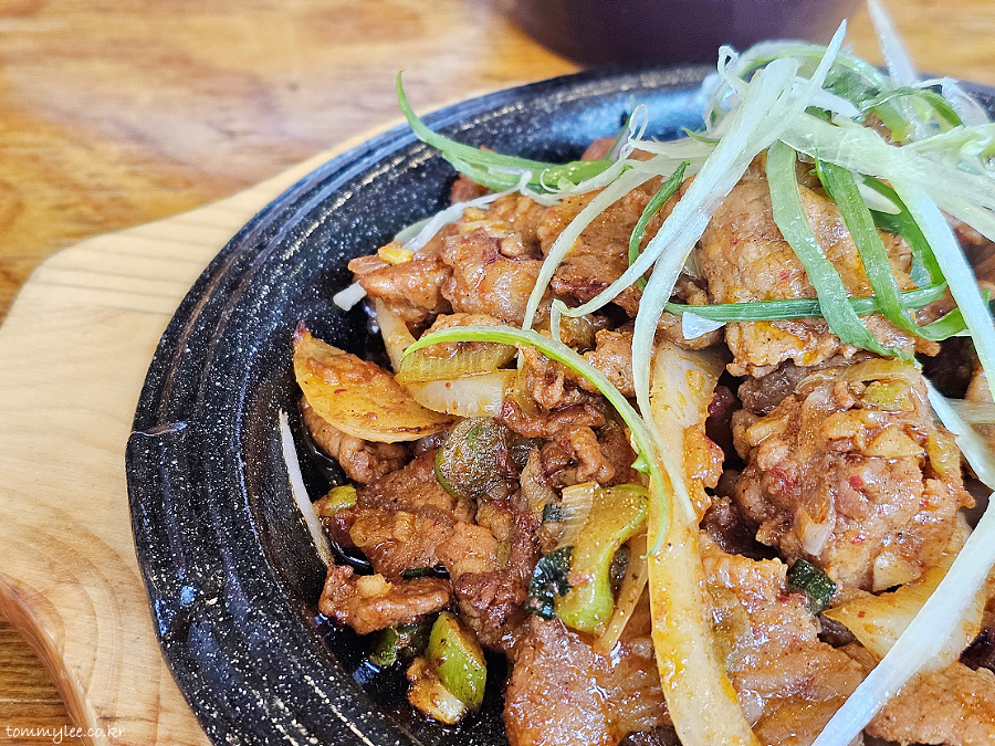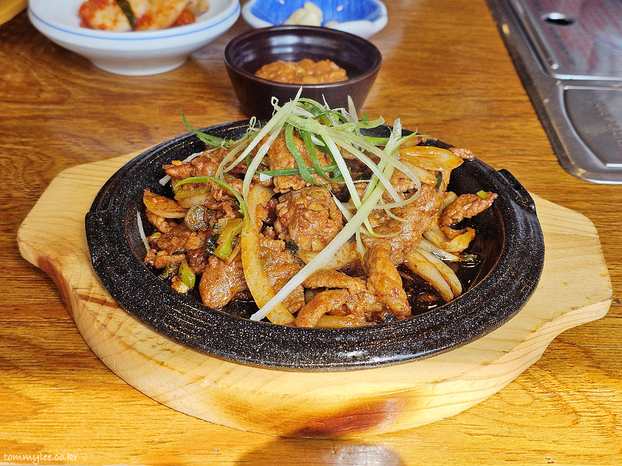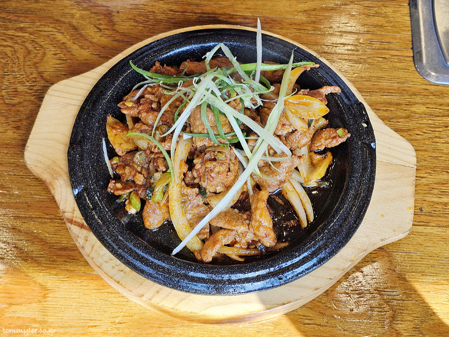 뜨거운 무쇠 플레이트에 제공된 제육 불고기의 모습이 되겠습니다.. 비빔밥보다 더 빨리 나온 점을 지인분께서 높이 평가해 주셨습니다..