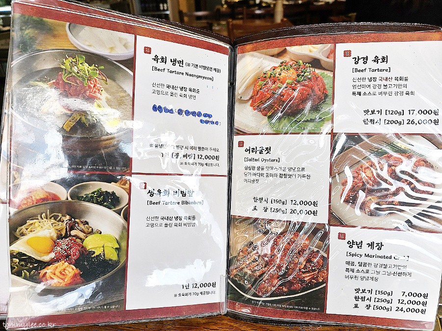 육회냉면 12,000원, 생육회비빔밥 12,000원, 강경육회 12,000원 17,000원, 어리굴젓 12,000원 20,000원, 양념게장 7,000원 12,000원 24,000원..