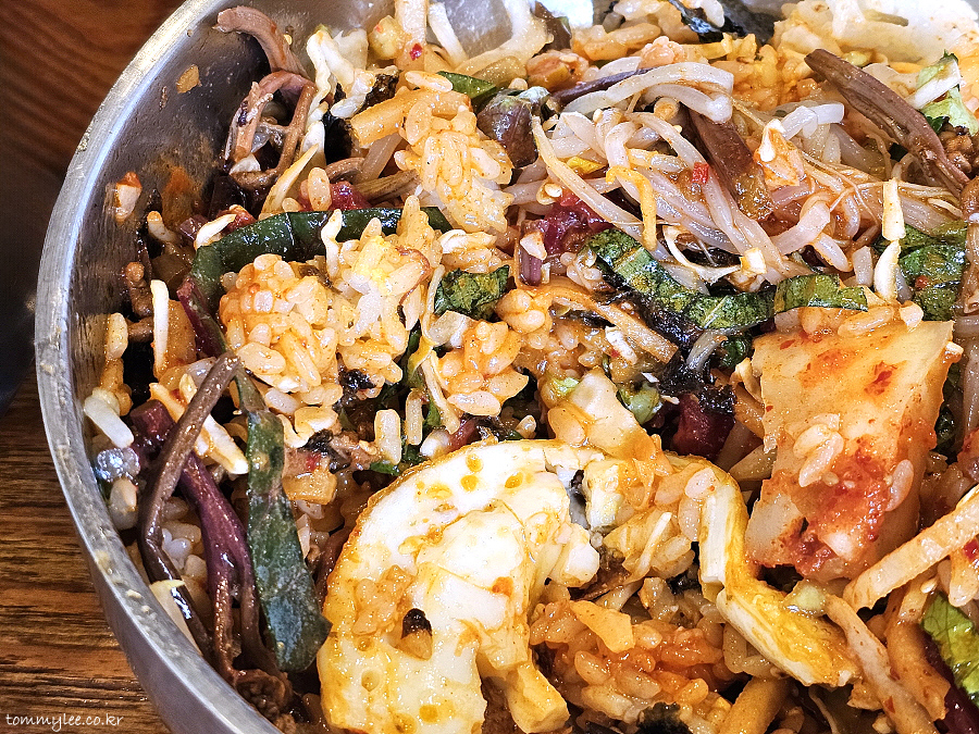 양배추, 깻잎 등의 신선한 야채들이 슬라이스 되어 들어가고요.. 나물들은 시금치, 고사리, 숙주, 무채 나물 이렇게고 김가루에 통깨 토핑까지 다채로운 구성..