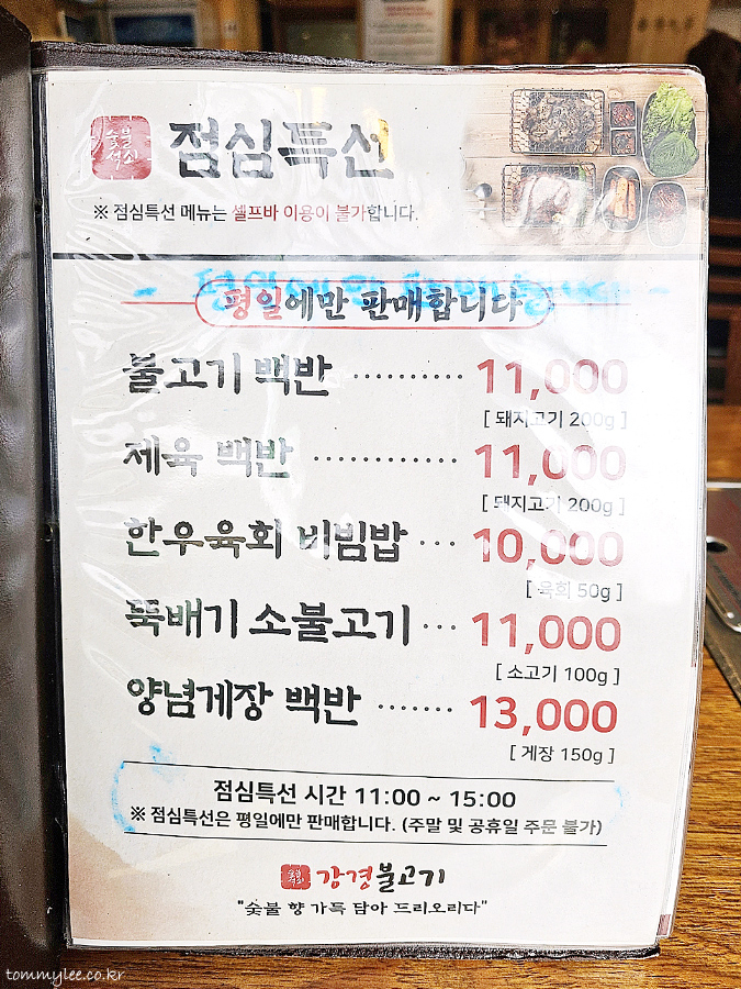 평일 점심특선.. 불고기백반 11,000원, 제육백반 11,000원, 한우육회비빔밥 10,000원, 뚝배기소불고기 11,000원, 양념게장백반 13,000원..