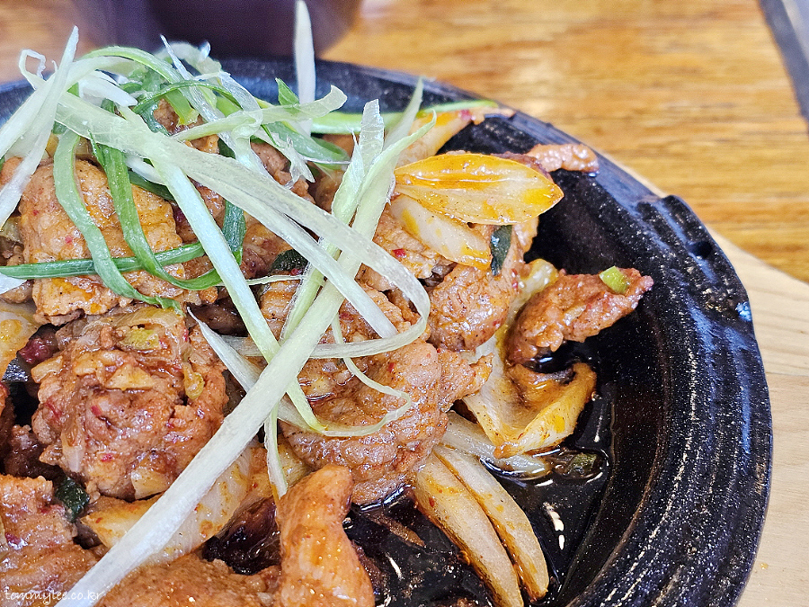 도톰한 돼지고기가 양파와 함께 매콤한 제육 양념에 잘 볶아져 나왔습니다.. 파채가 토핑 되어 먹음직스러운 비주얼..