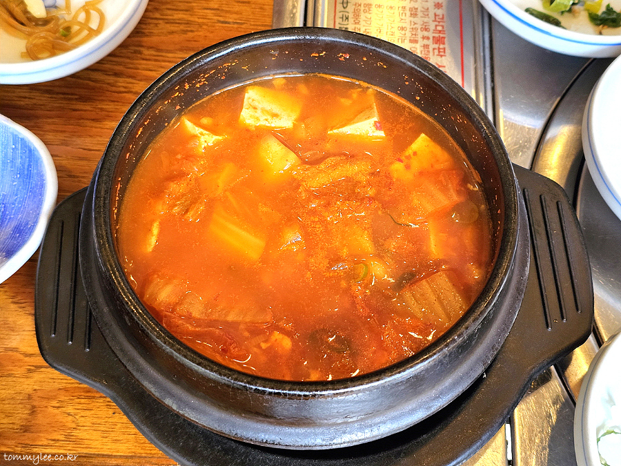 맹렬하게 연기를 뿜어내며 나온 뚝배기 김치찌개.. 국 대신에 찌개가 제공되네요.. 오호~..