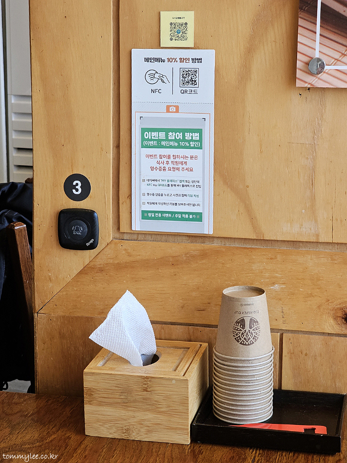 3번 테이블이었고요.. 테이블번호 아래에 있는 벨을 누르면 직원 호출 가능.. 네이버 플레이스 리뷰 이벤트가 있네요.. 평일 네이버 영수증 리뷰를 작성하신 후 직원에게 제시하면 메인메뉴 10% 할인이 된다고 합니다..