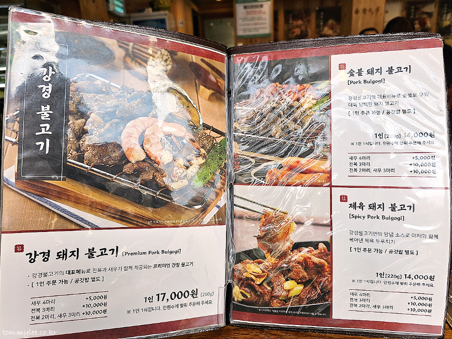강경돼지불고기 17,000원, 숯불돼지불고기 14,000원, 제육돼지불고기 14,000원.. 추가메뉴 : 새우4마리 5,000원, 전복3마리 10,000원, 전복2마리&새우3마리 10,000원..