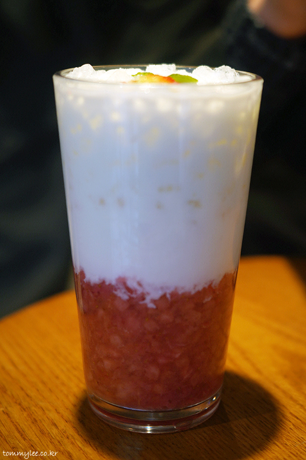 설향 딸기청이 음료의 2/5 정도는 되는 것 같아요.. 경쟁업체 딸기 라떼보다 확실히 우위에 있는 듯.. 얼음 우유 위의 깔기 장식과 애플민트잎도 귀엽고요..