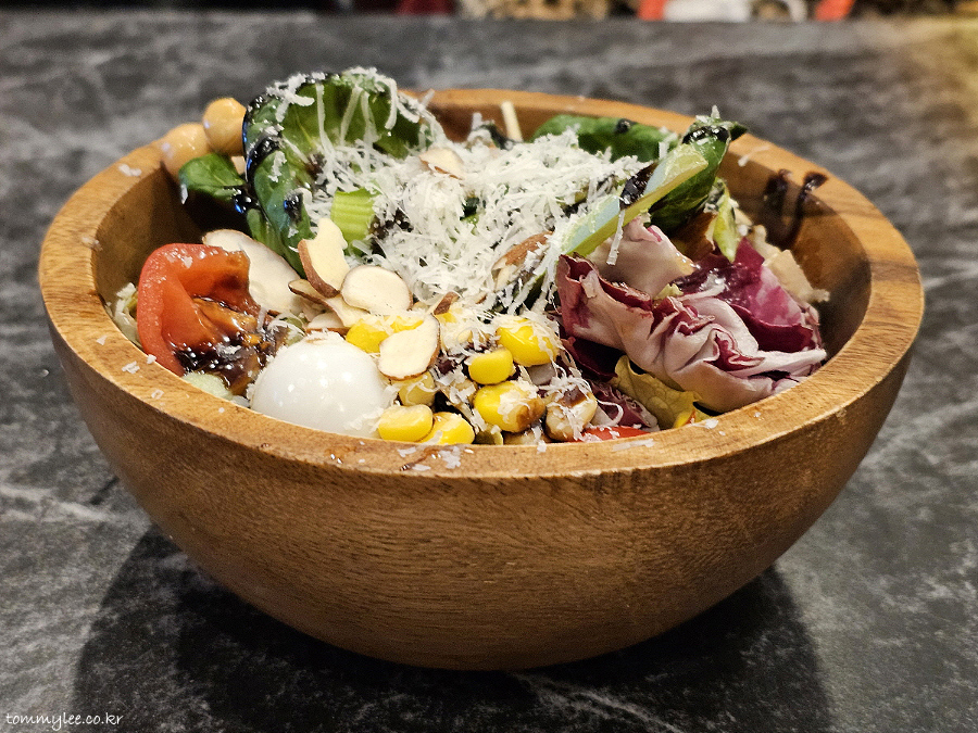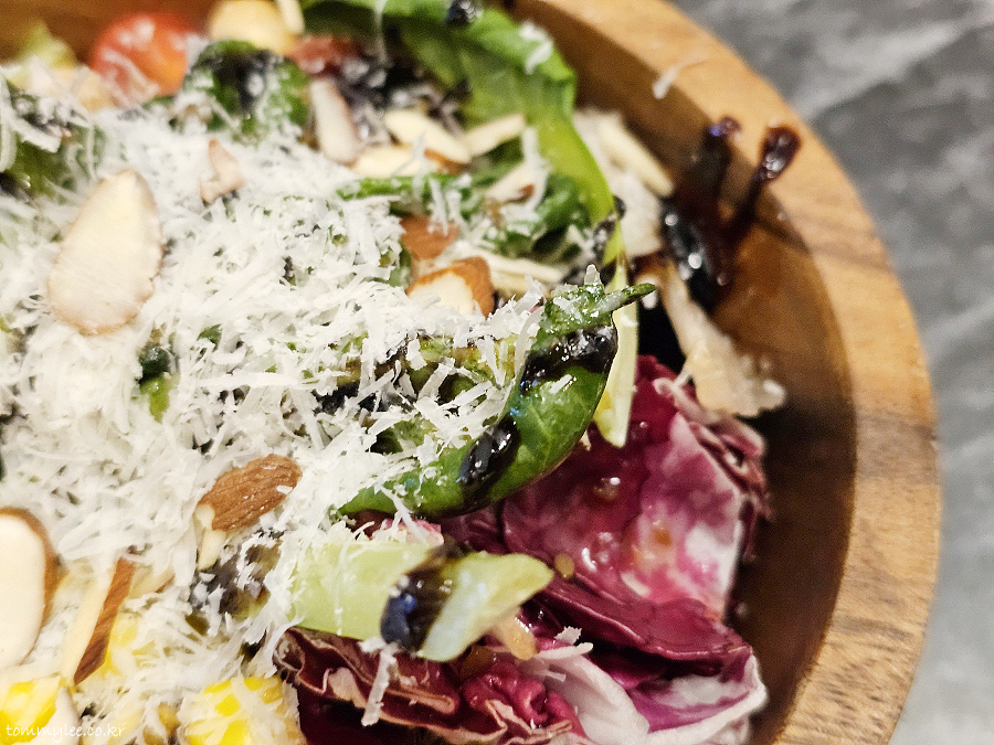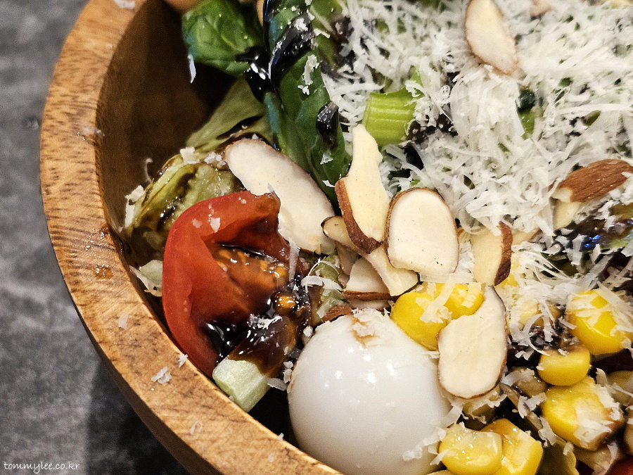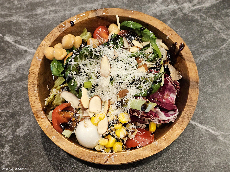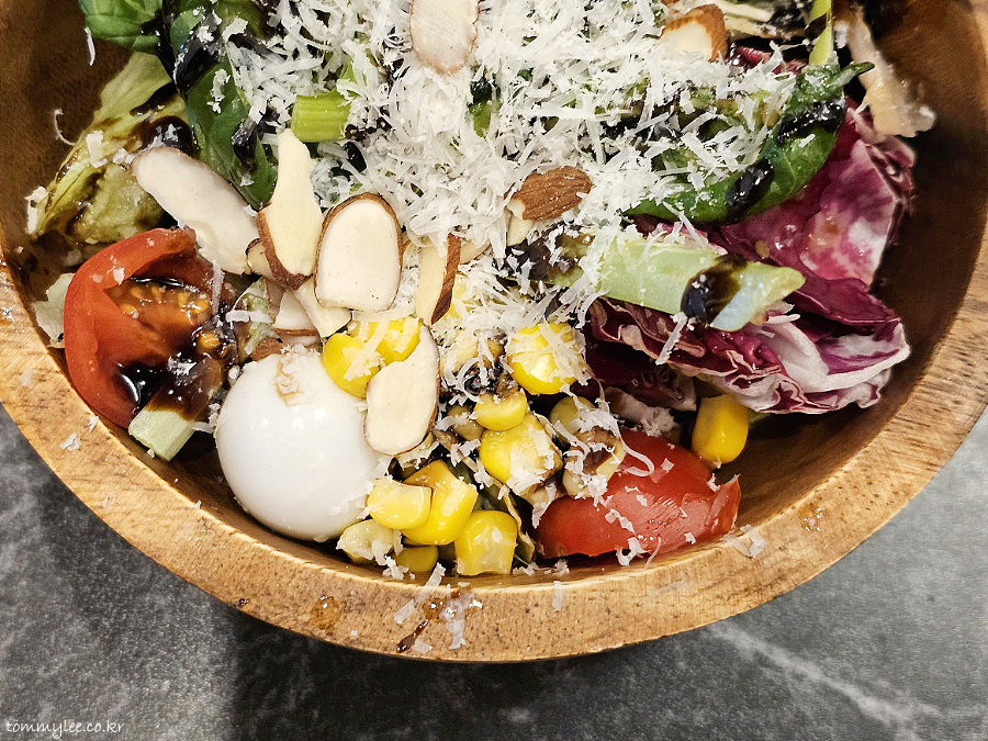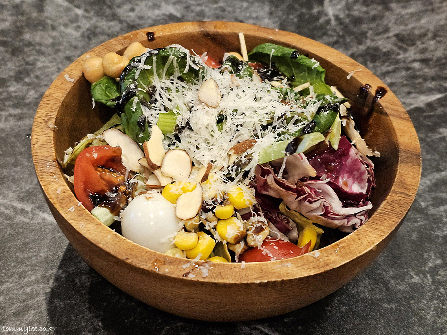 샐러드 믹스가 양상추 위주의 단조로운 구성을 벗어나 그린그린하니 매우 다채롭고요.. 치즈와 아몬드 슬라이스 토핑이 푸짐하고.. 드레싱도 과하지 않음, 발사믹 드리즐 양 딱 적당..