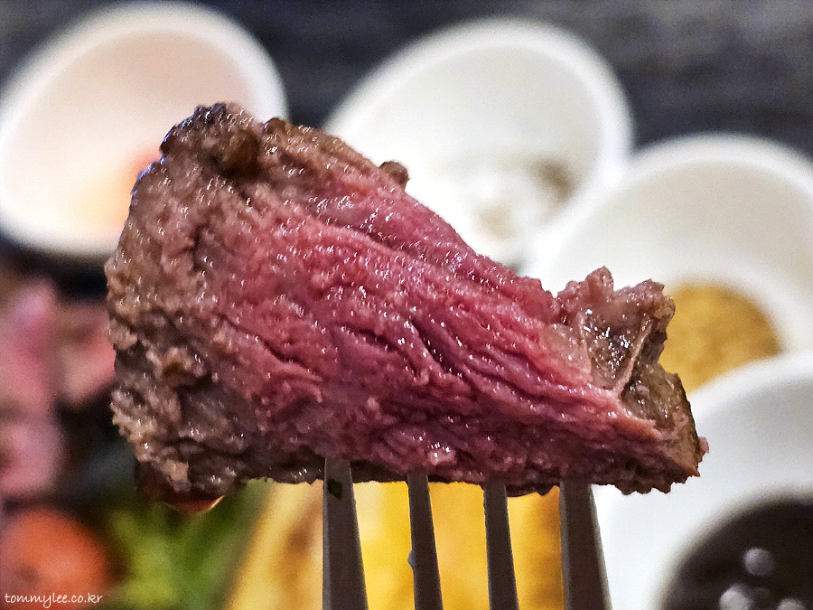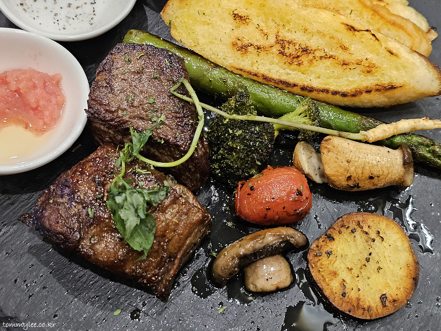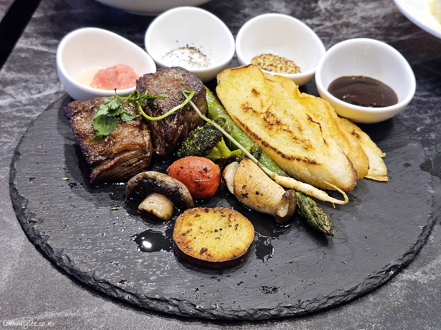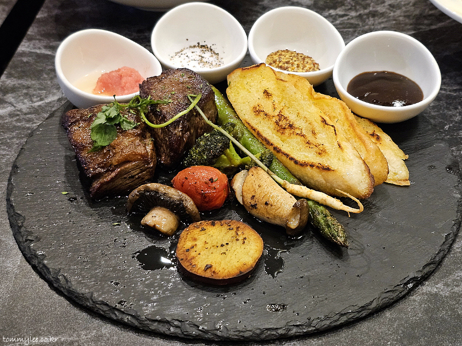 저는 딸리아따 스테이크 스타일로 나올 줄 알았는데 전혀 아니었고요.. 가니시가 상당히 다채로워서 놀랐네요.. 아스파라거스, 브로콜리, 머쉬룸 믹스, 포테이토에 베이비진셍까지.. 애기삼이 올라갈 줄은 상상도 못함..