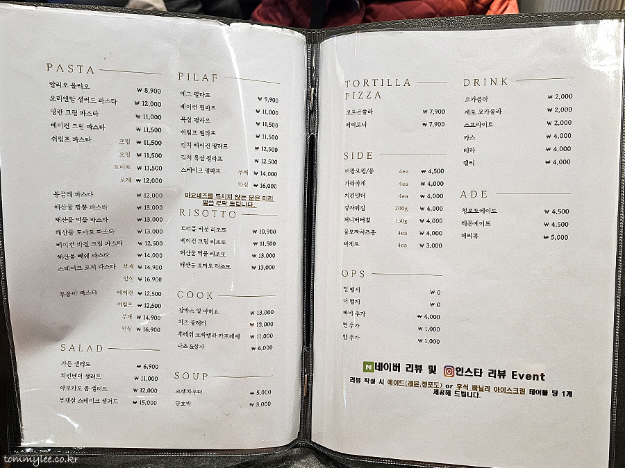 스테이크, 파스타, 필라프, 리조또, 샐러드, 피자, 안주 메뉴까지 선택의 폭이 많이 넓은 편.. 파스타가 8,900원~로 가격 매우 좋고요..