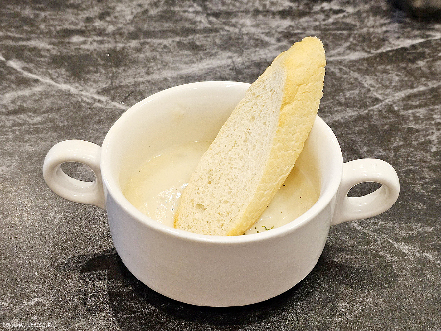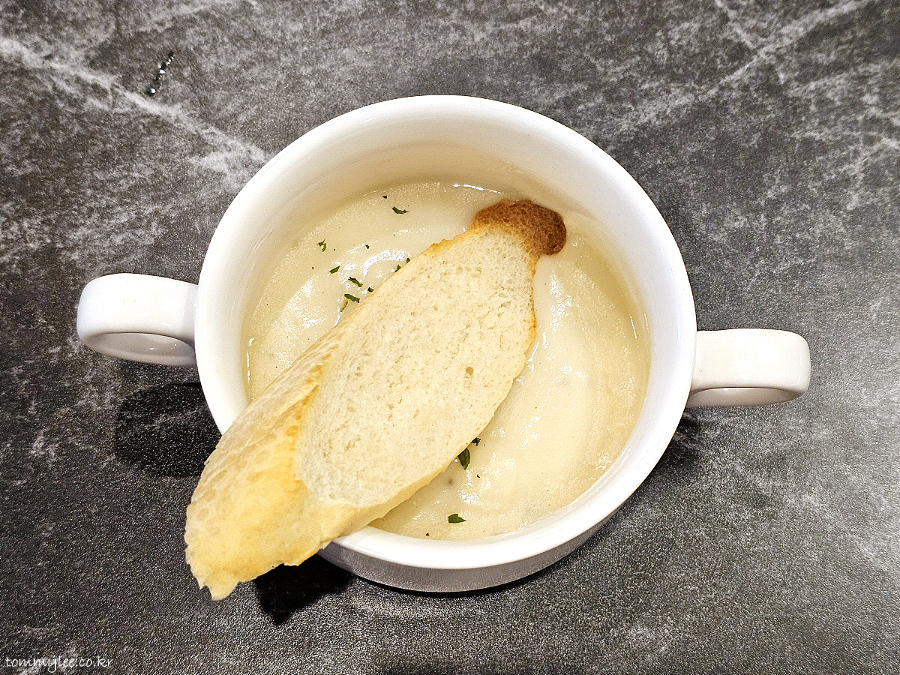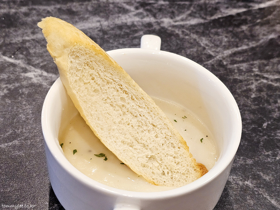 어쨌거나 크림수프에 길쭉하게 썰어낸 바게트 빵이 올려져서 나왔습니다.. 원래 서비스로 다 주는 건지.. 저희가 많이 시켜서 나온 건지는 모르겠어요.. 저도 궁금..