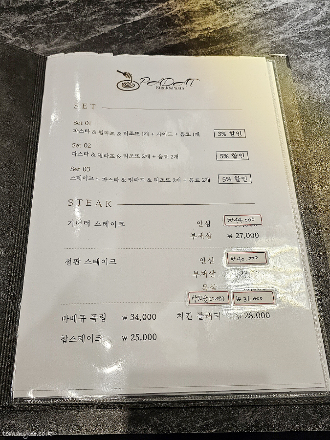 PADAT MENU.. 빠닷 메뉴판.. 세트로 주문하면 세트1,2,3 공히 음료를 무조건 마셔야 하고, 할인율이 3~5%로 많이 야박해서 주문하고 싶단 생각이 전혀 들지 않았네요.. ㅡㅡ;;.. 동네 비스트로치곤 스테이크가 4종이나 되고 폭립까지도 있음.. 괜히 스테이크 앤 파스타가 아니었네요..