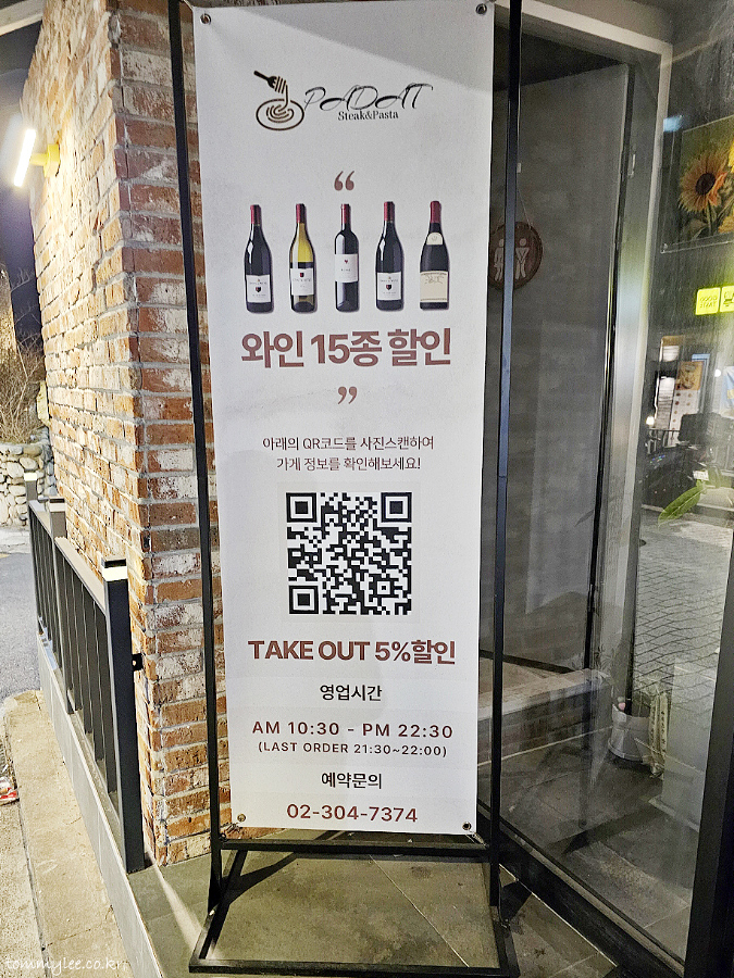 이탈리안 비스트로를 추구하시는 것 같아요.. 무려 와인을 15종이나 갖추고 계시다고 합니다.. 사진의 QR코드를 찍어보면 네이버 플레이스로 연결되는데.. 네이버에 쿠폰 2종이 있답니다.. 1천원 할인쿠폰보다는 리뷰 에이드&아이스크림 쿠폰이 꽤 쓸만하다고 생각되더군요.. 먹다 말고 리뷰 쓰긴 좀 그래서.. 아쉽게도 쿠폰 사용은 못함..