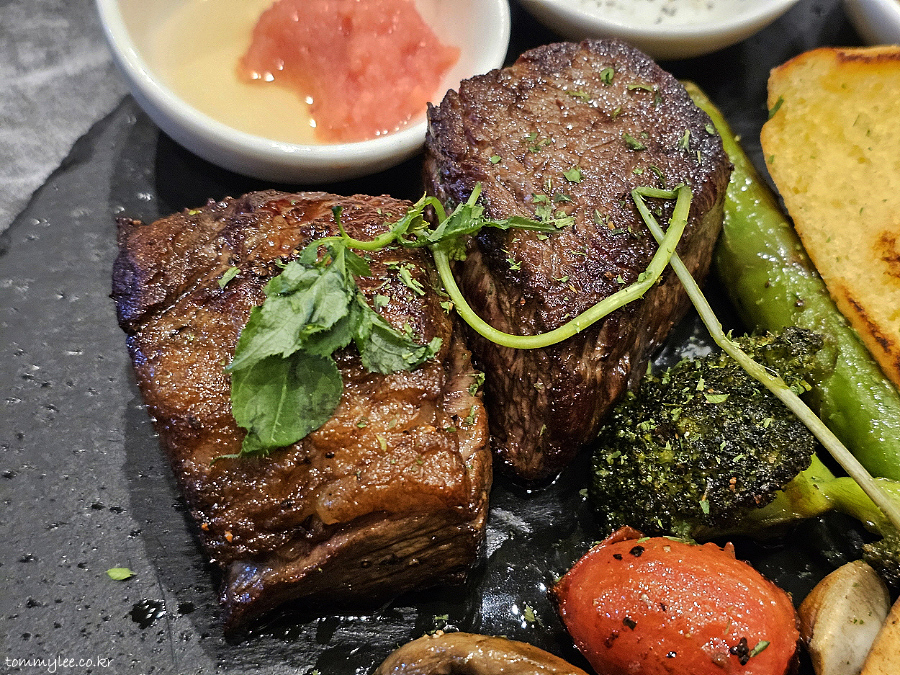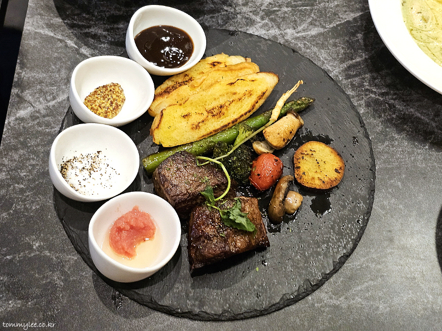 오늘의 주인공인양 스테이크가 마지막에 등장해 주었습니다.. 블랙스톤의 돌 접시에 제공.. 믿기지 않지만 안심 스테이크는 무려 국내산 한우를 사용하고 있다고 합니다.. 혼또??..