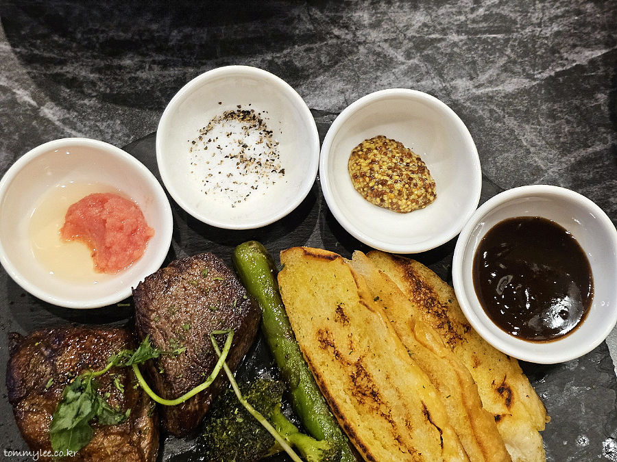 스테이크 소스도 무려 4가지나 함께 제공되어 버라이어티 한 맛을 즐길 수 있네요.. 왼쪽에서부터 명란오일, 허브솔트, 홀그레인머스터드, 시그니처 스테이크 소스..