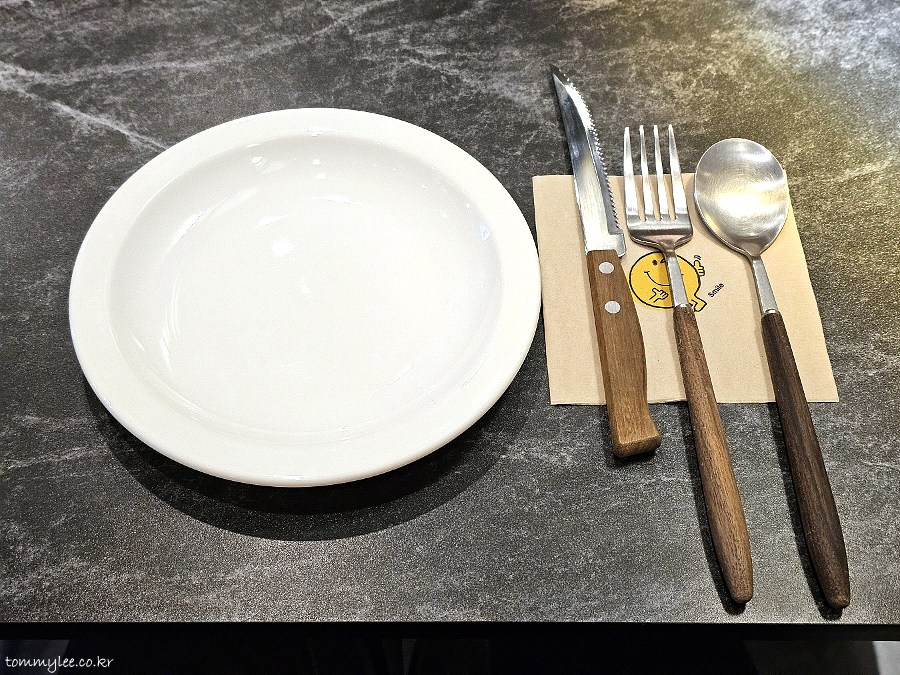 앞접시와 커틀러리 샷.. 냅킨이 상당히 귀여워요.. 저 스마일 캐릭터 뭐지.. 암튼 귀엽..