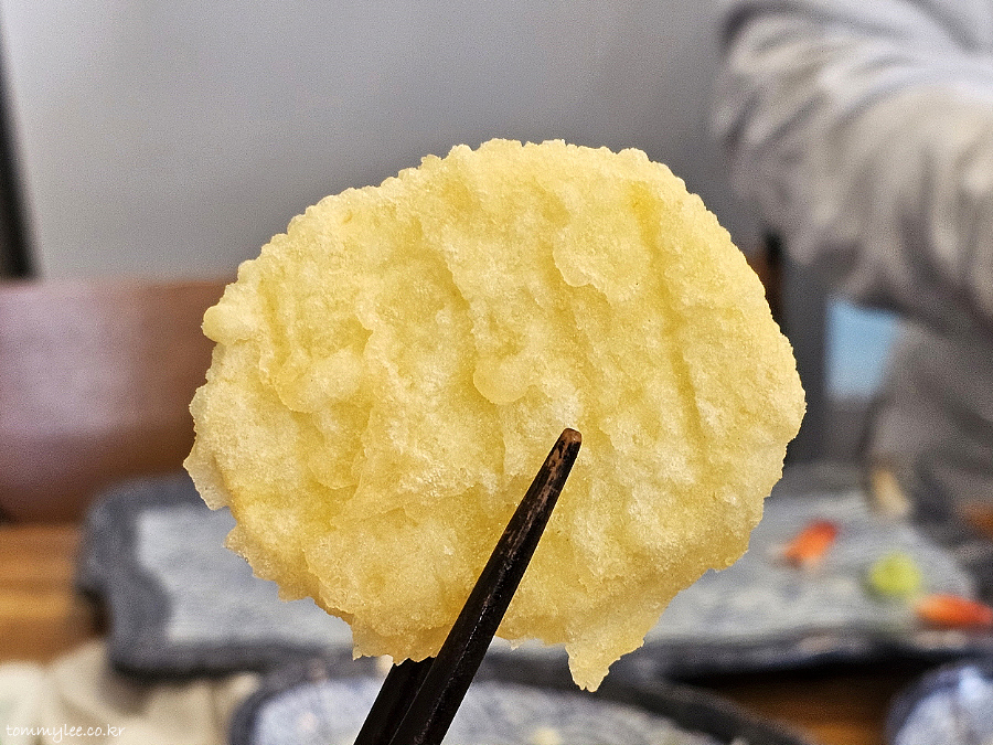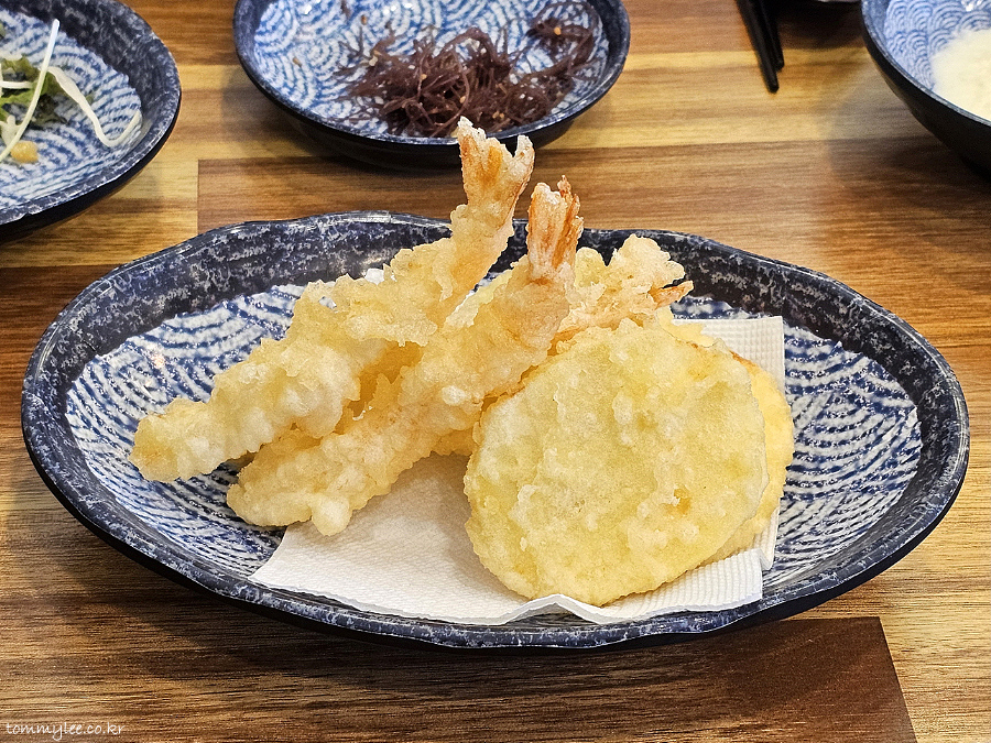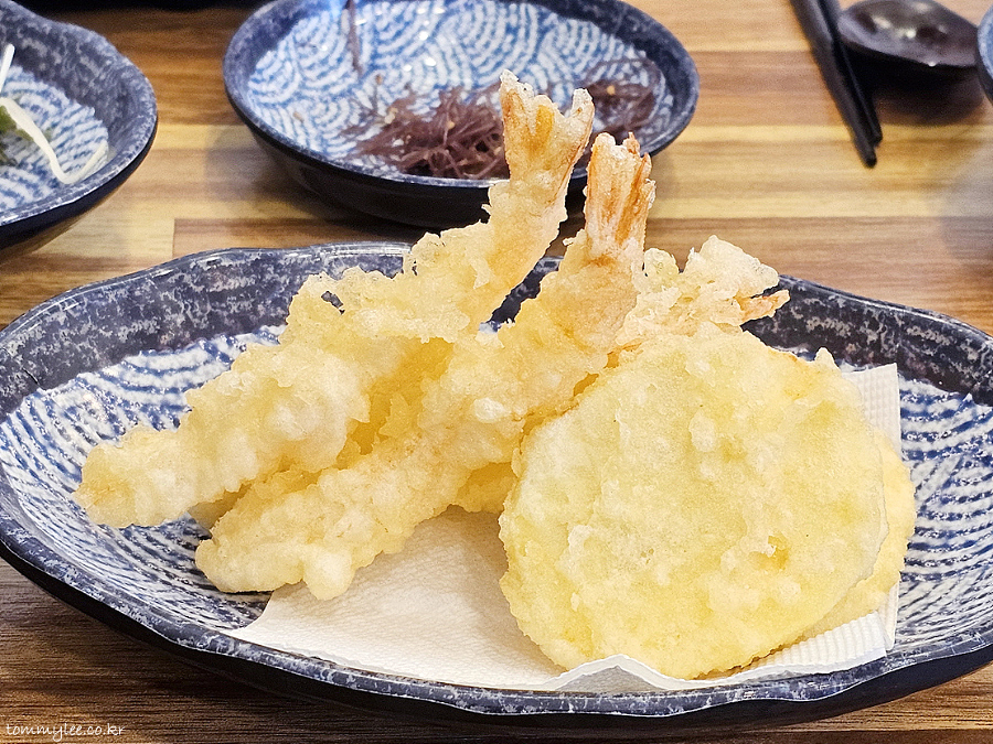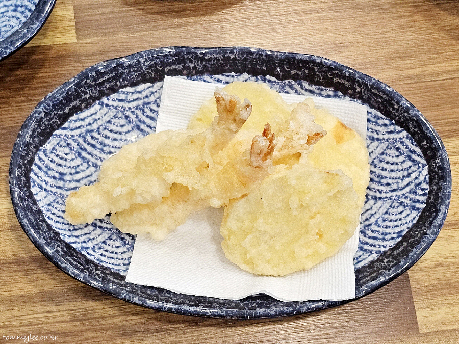 런치 서비스 튀김입니다.. 텐푸라 스타일의 튀김이고요.. 1인당 새우튀김 1, 고구마튀김 1이 제공되는 듯 합니다.. 튀김 종류는 수급상태에 따라 달라질 수도..
