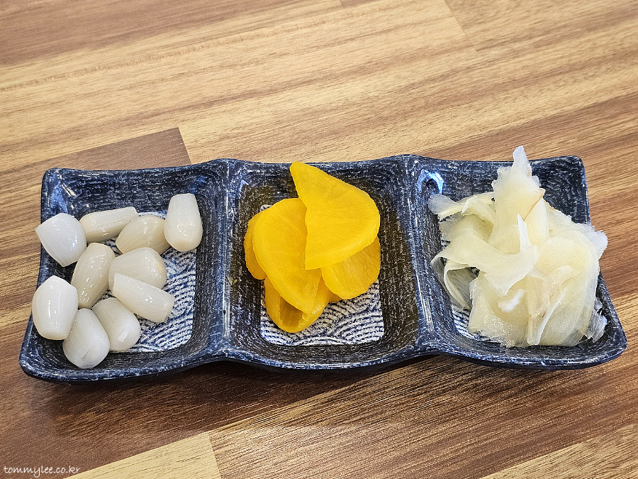 바로 쓰끼다시 깔립니다.. 왼쪽부터 락교, 다쿠앙, 가리..