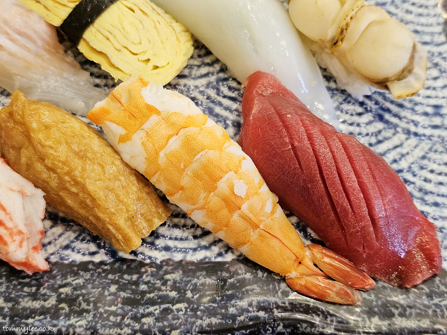 유부초밥, 새우초밥, 참치초밥입니다.. 아카미 초밥이 인상적이었는데요.. 색이 곱고 칼집이 들어가서 식감도 더 부드럽게 어렌지한 상냥함이 느껴짐..