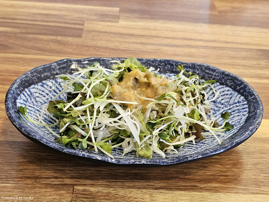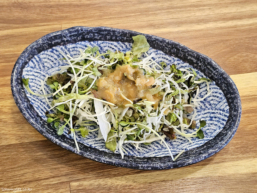 샐러드도 나오네요.. 샐러드믹스는 양배추, 상추에 무순 조합 정도로 무난한 느낌이지만.. 드레싱은 평범하지 않은 홈메이드에요.. 유니크한 미소 드레싱..