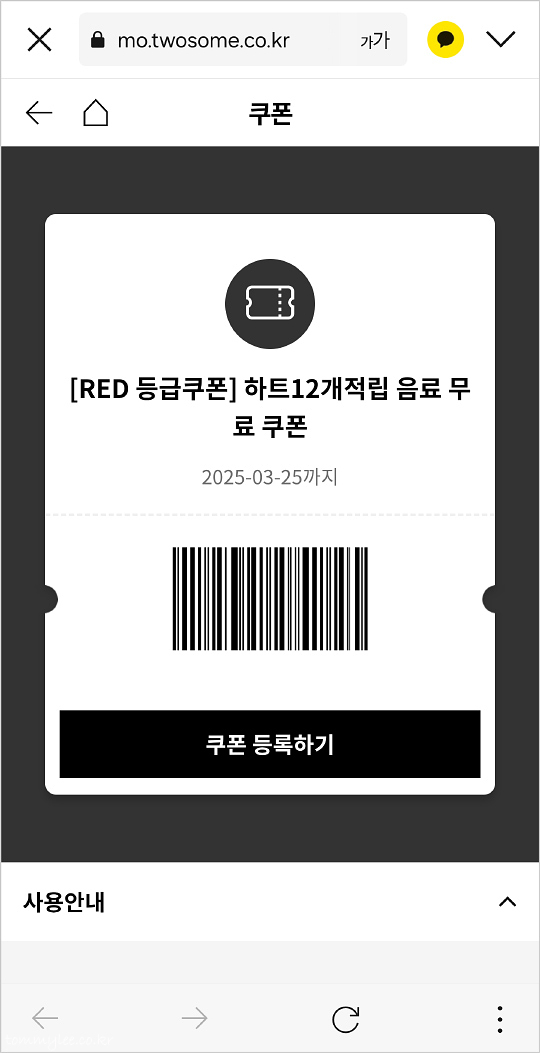 이렇게 카카오톡으로 투썸플레이스 쿠폰을 보내면 쿠폰 등록하기로 내 투썸앱에 쿠폰을 등록할 수가 있답니다..